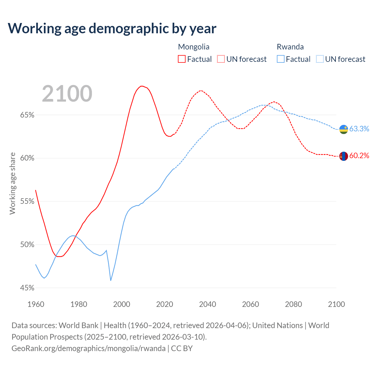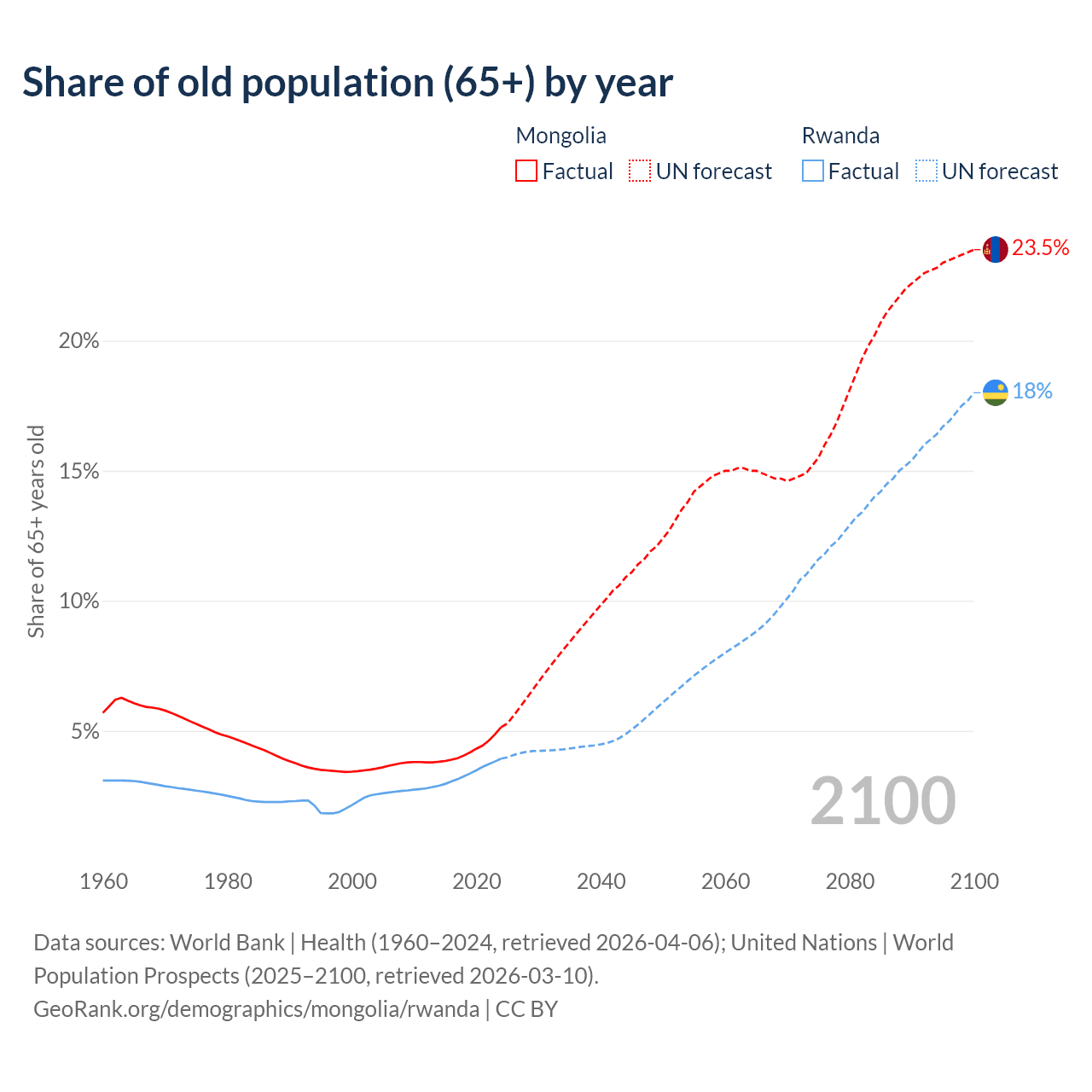The share of older people aged 65 and over is 5.14% in Mongolia and 3.93% in Rwanda. Life expectancy in Mongolia compared to Rwanda .
