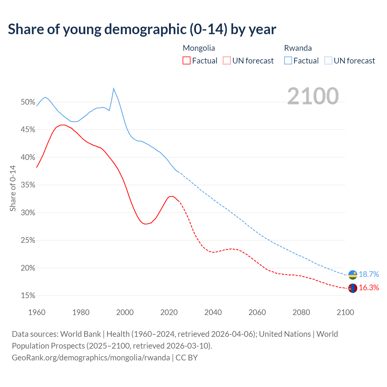 - The share of young demographic (0-15 years old) in Mongolia is 32.2% vs 37.4% in Rwanda.