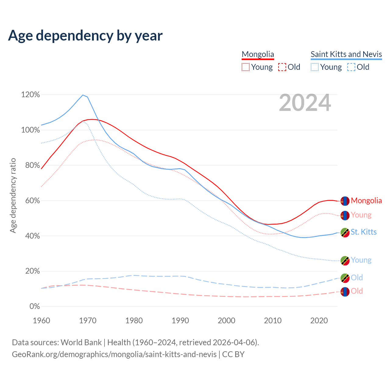 - Mongolia is ranked 117/196 by median age (oldest to youngest) vs 69/196 for Saint Kitts and Nevis.