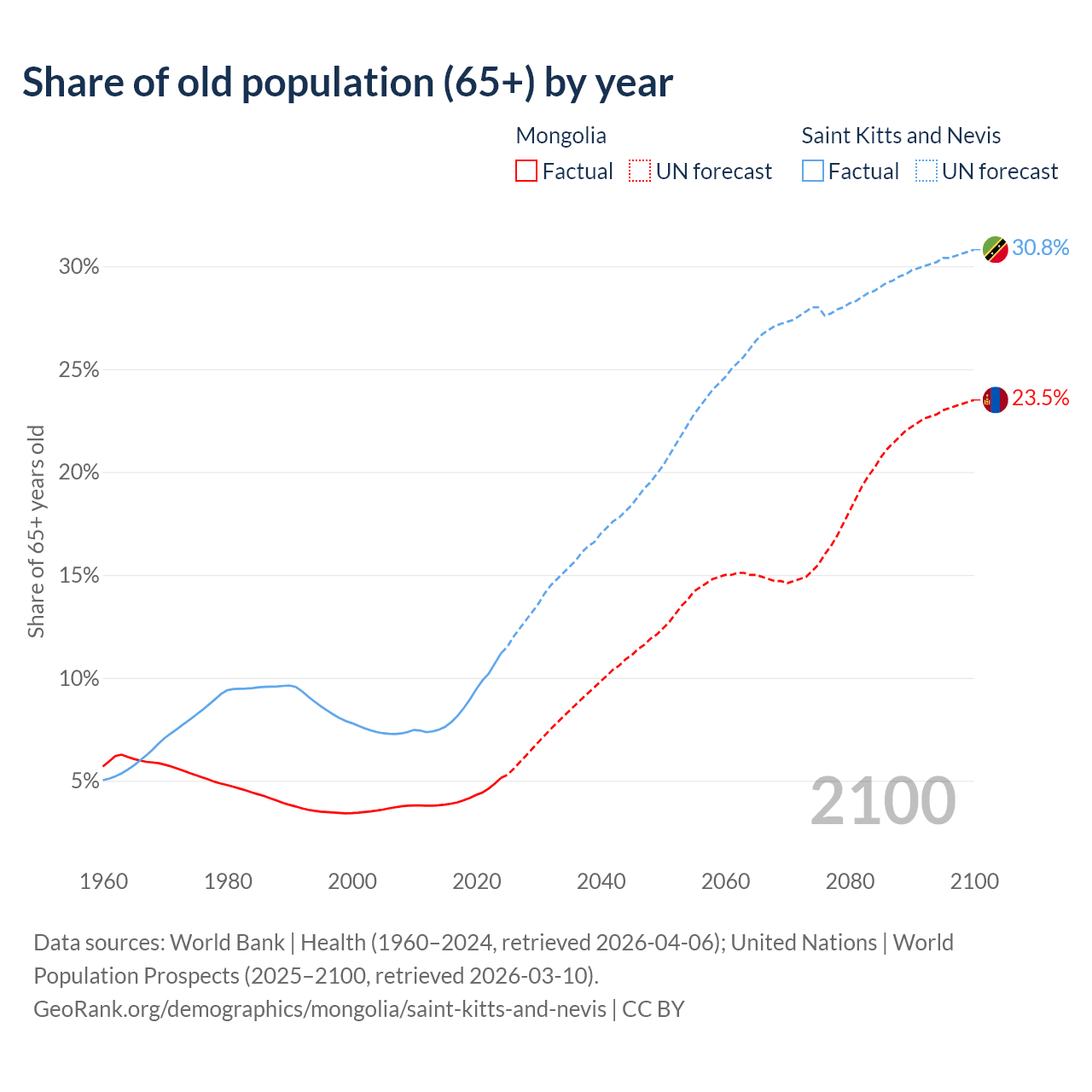 The share of older people aged 65 and over is 5.14% in Mongolia and 11.2% in Saint Kitts and Nevis. Life expectancy in Mongolia compared to Saint Kitts and Nevis .