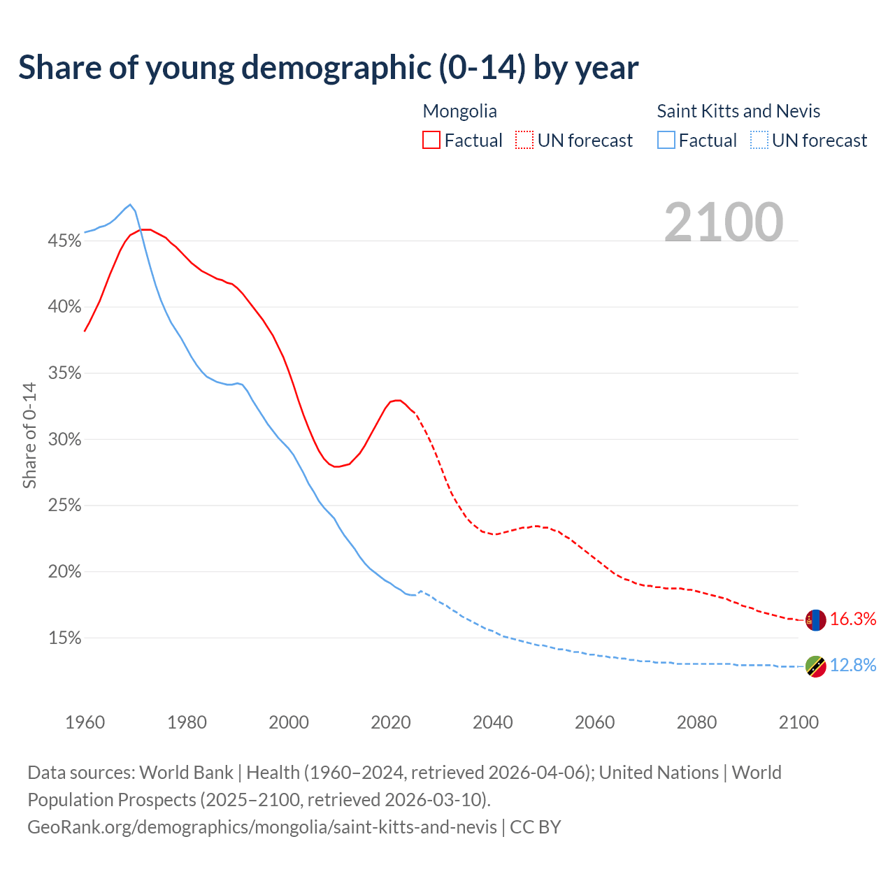- The share of young demographic (0-15 years old) in Mongolia is 32.2% vs 18.2% in Saint Kitts and Nevis.