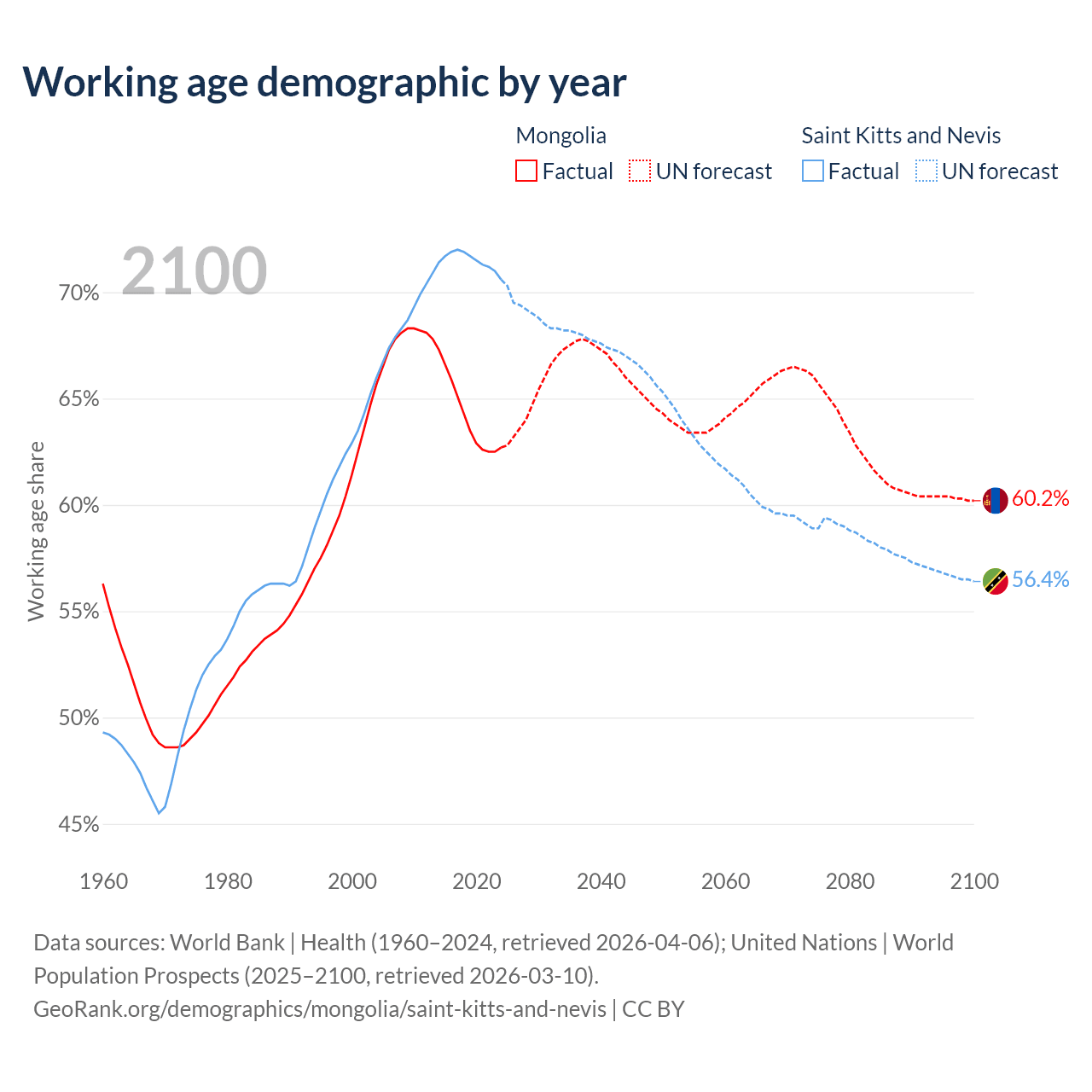 - Mongolia has 2.27M working age adults (aged 15-64) vs 33.2K in Saint Kitts and Nevis.