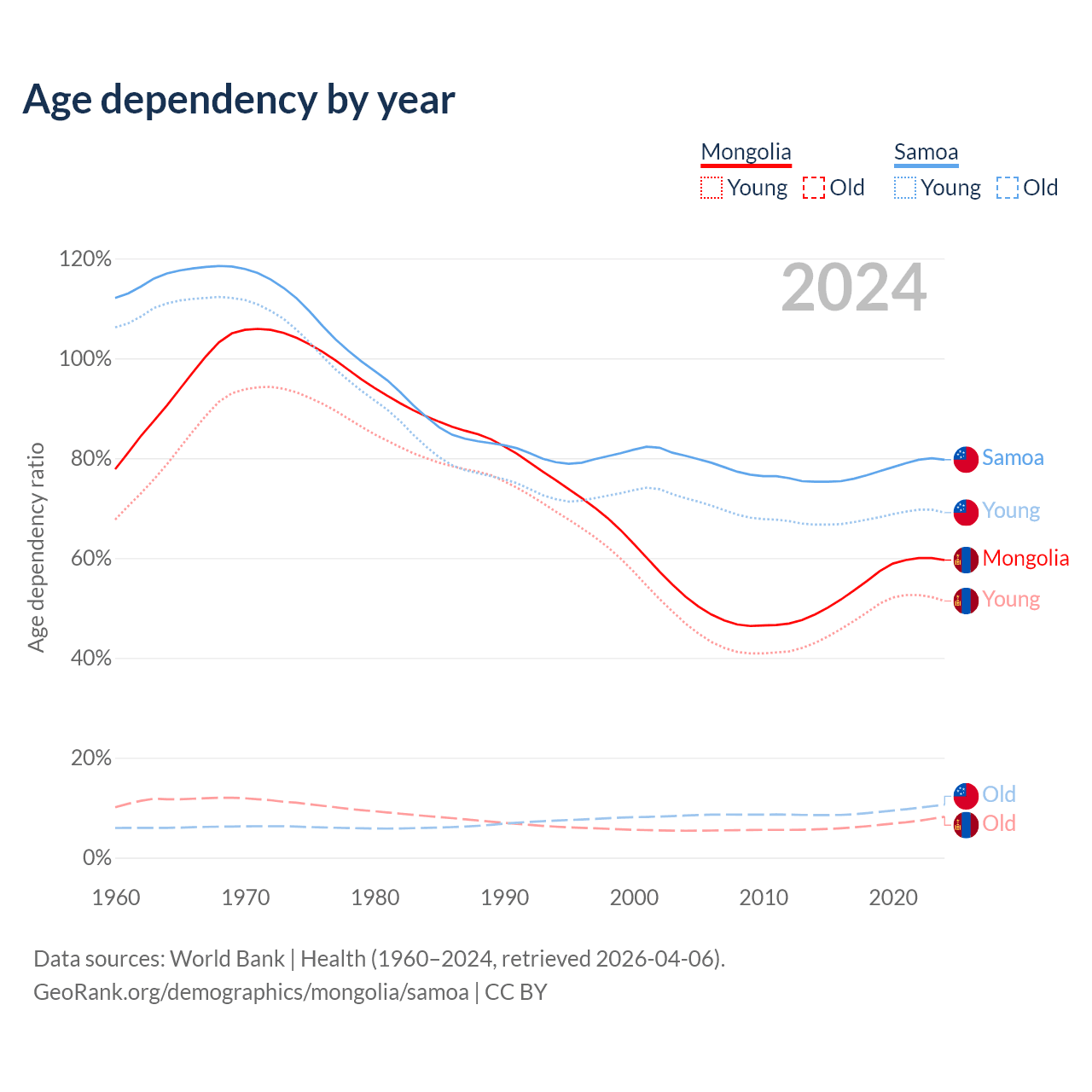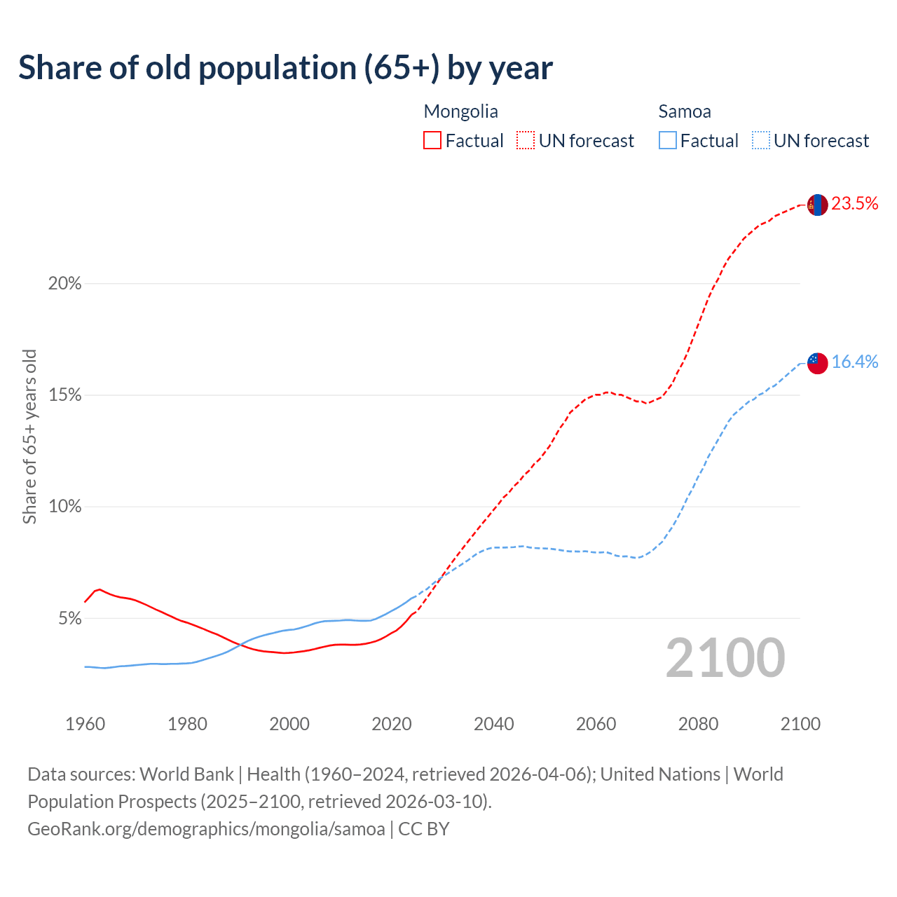 - The share of old-age demographic (65+) in Mongolia is 5.14% vs 5.88% in Samoa.