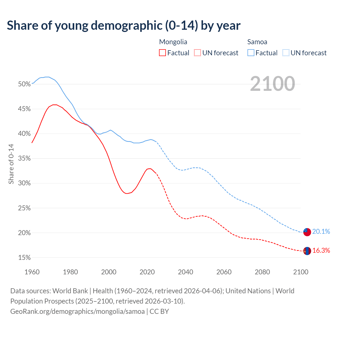 - The share of young demographic (0-15 years old) in Mongolia is 32.2% vs 38.5% in Samoa.