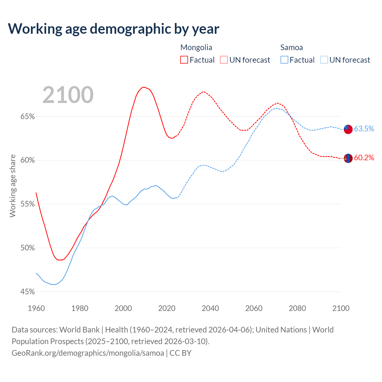 - Mongolia has 2.27M working age adults (aged 15-64) vs 123K in Samoa.