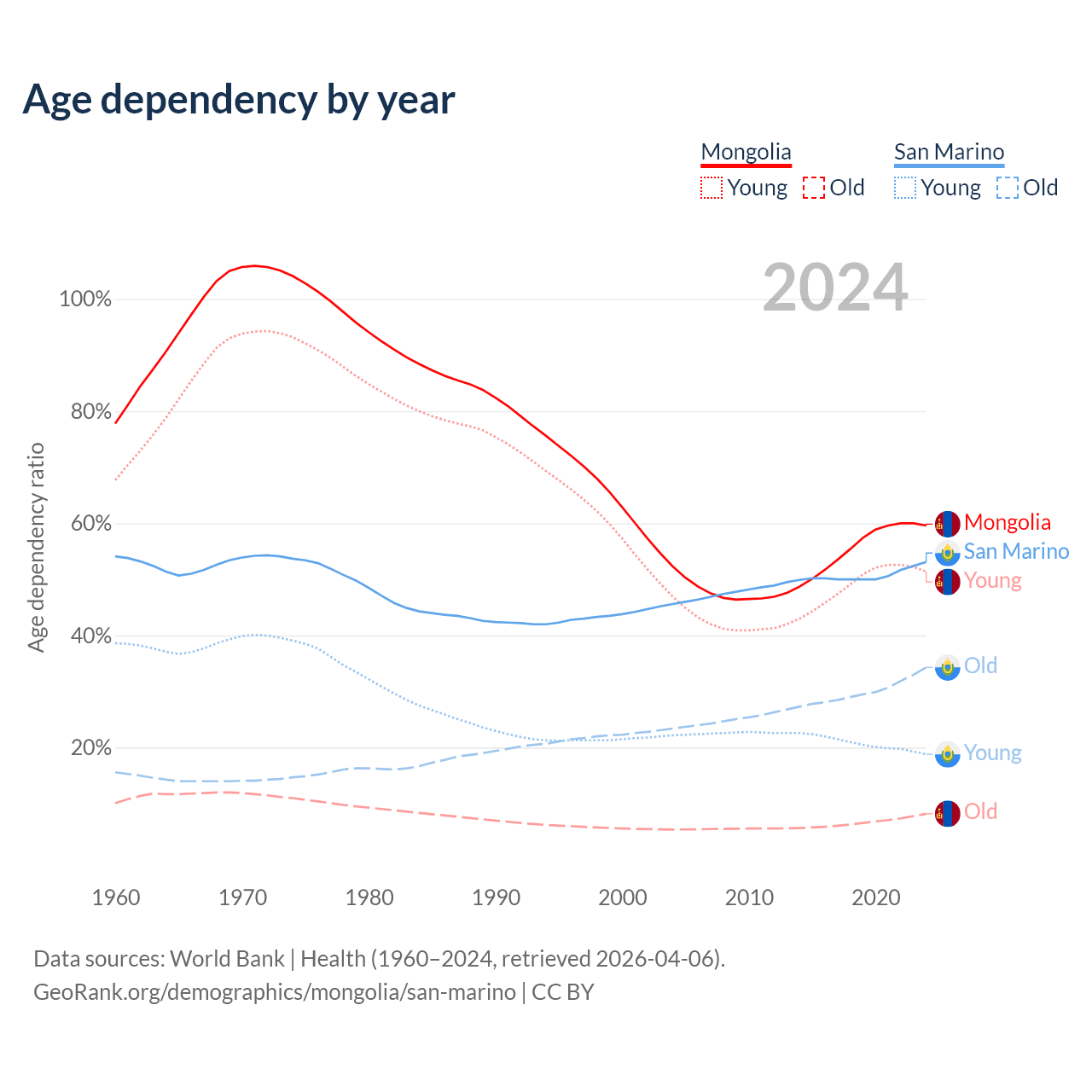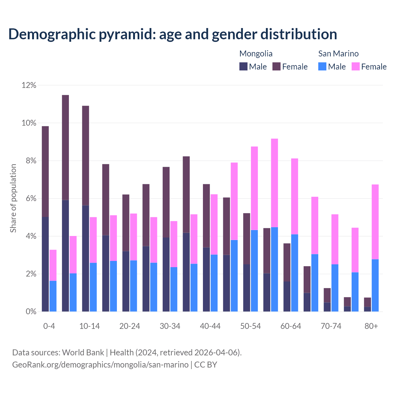 - Mongolia is ranked 117/196 by median age (oldest to youngest) vs 3/196 for San Marino.
