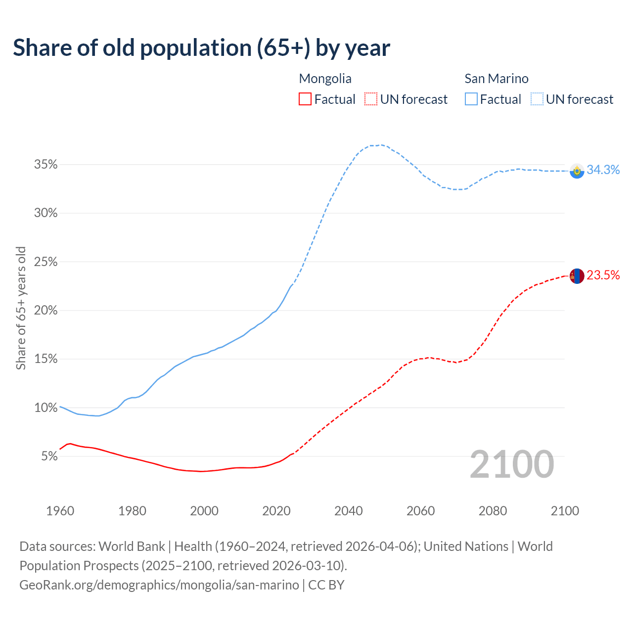 The share of older people aged 65 and over is 5.14% in Mongolia and 22.4% in San Marino. Life expectancy in Mongolia compared to San Marino .