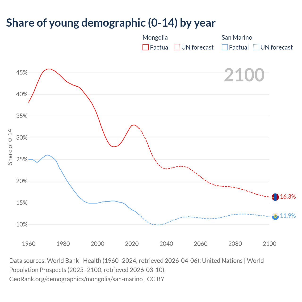 - The share of young demographic (0-15 years old) in Mongolia is 32.2% vs 12.3% in San Marino.