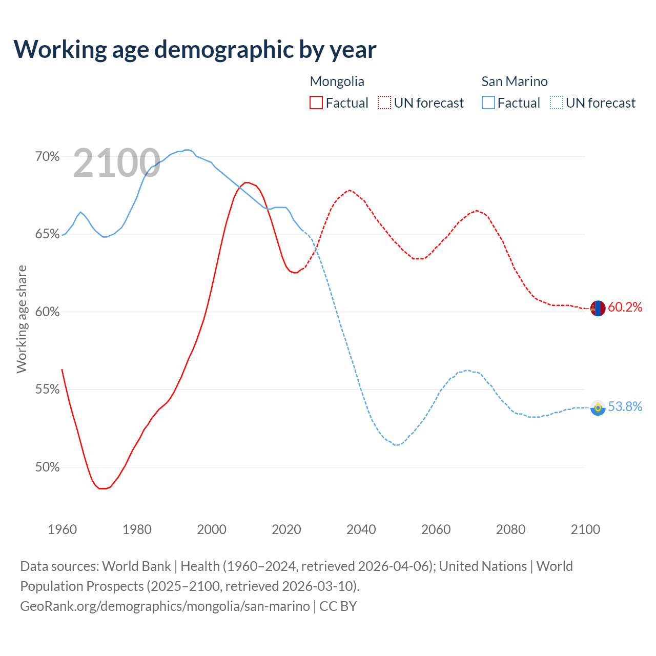 - Mongolia has 2.27M working age adults (aged 15-64) vs 22.2K in San Marino.
