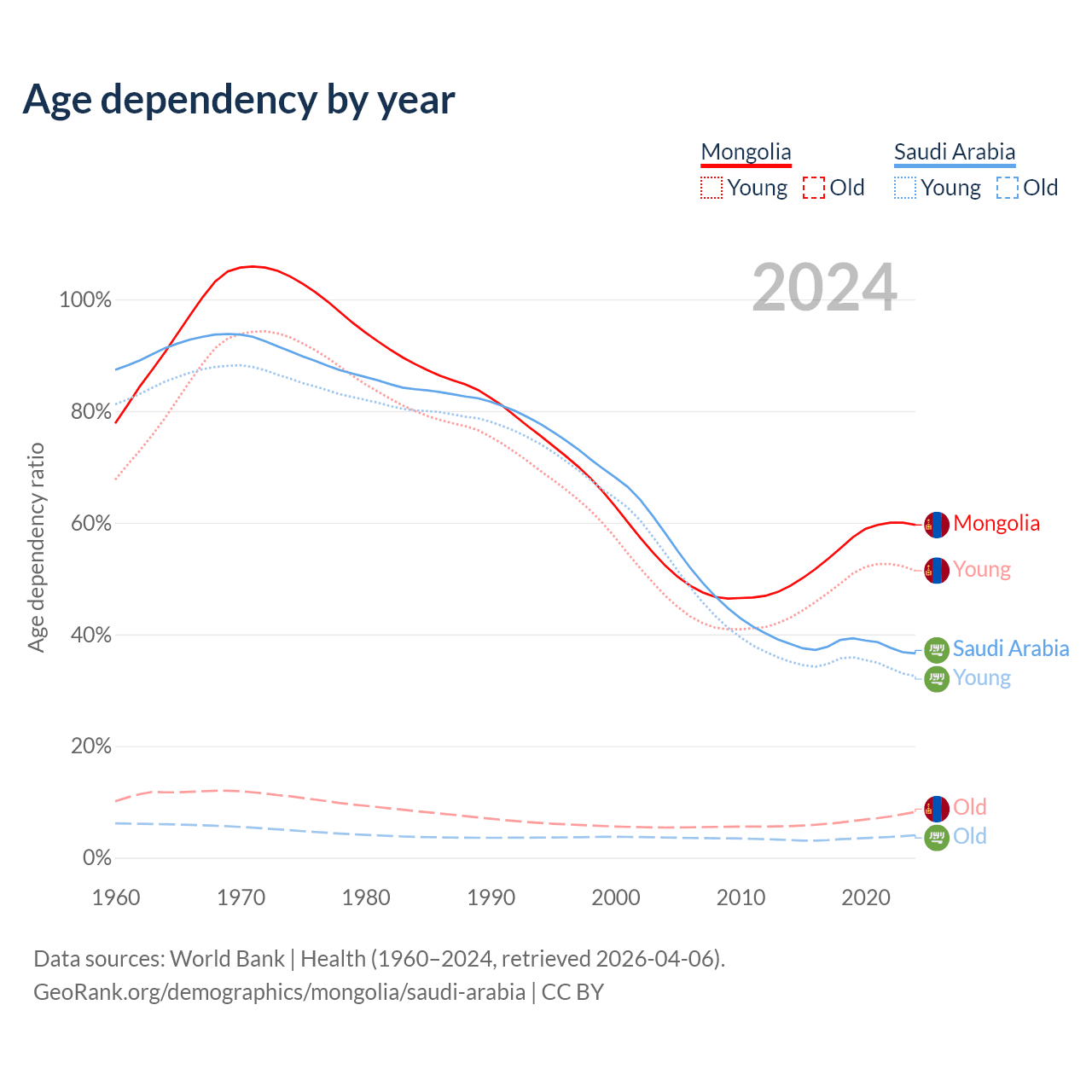 - Mongolia is ranked 117/196 by median age (oldest to youngest) vs 98/196 for Saudi Arabia.