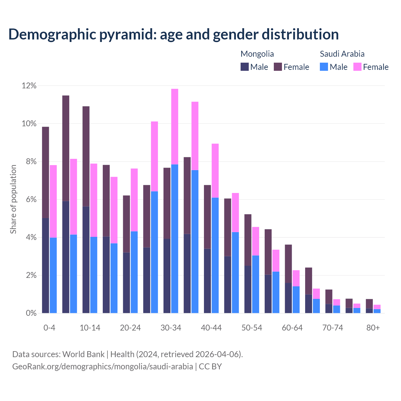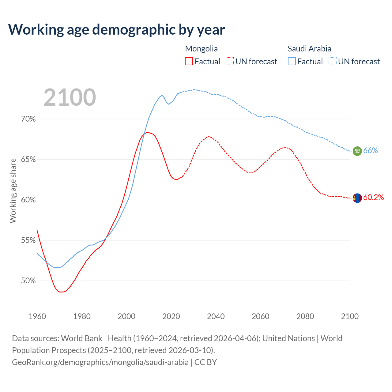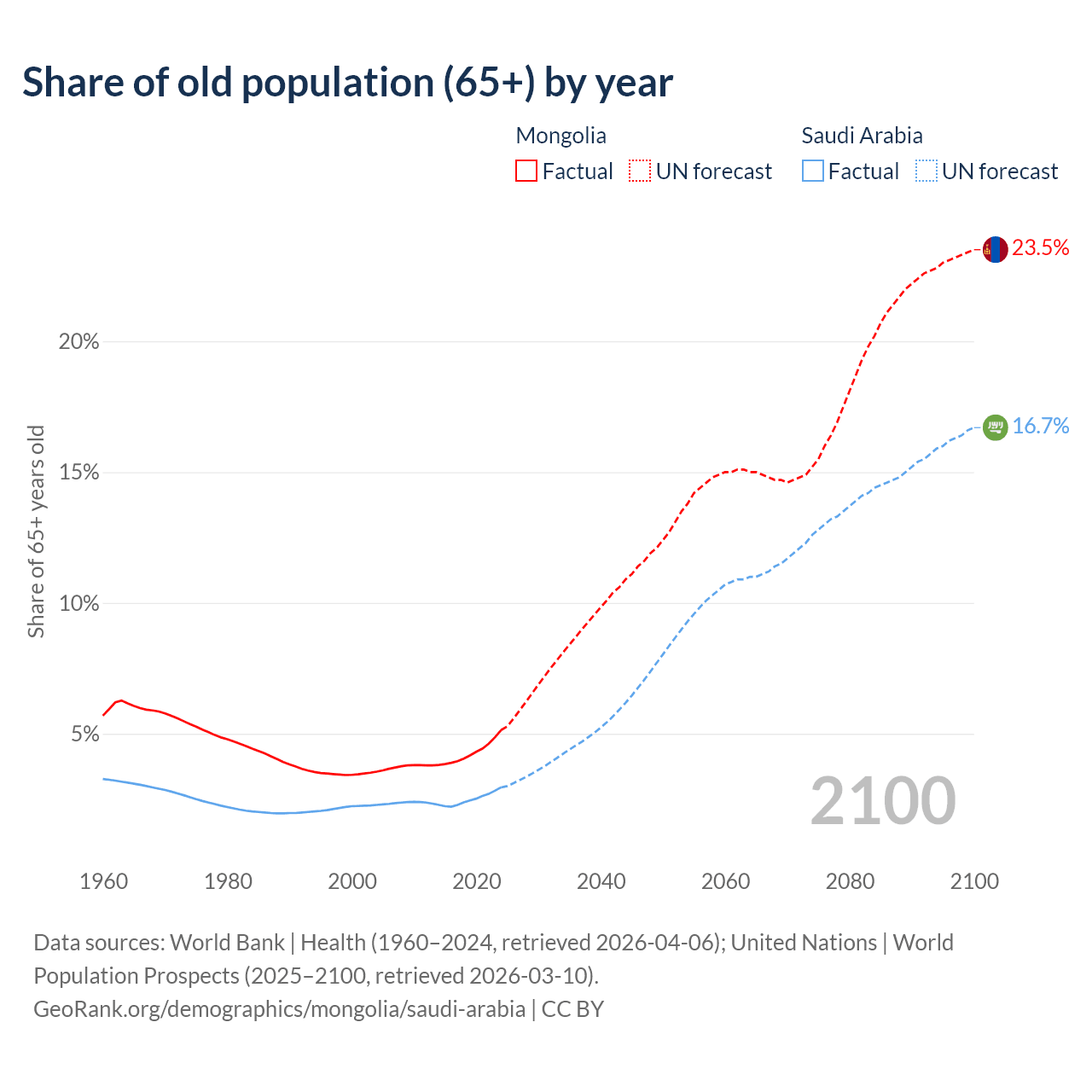 The share of older people aged 65 and over is 5.14% in Mongolia and 2.95% in Saudi Arabia. Life expectancy in Mongolia compared to Saudi Arabia .