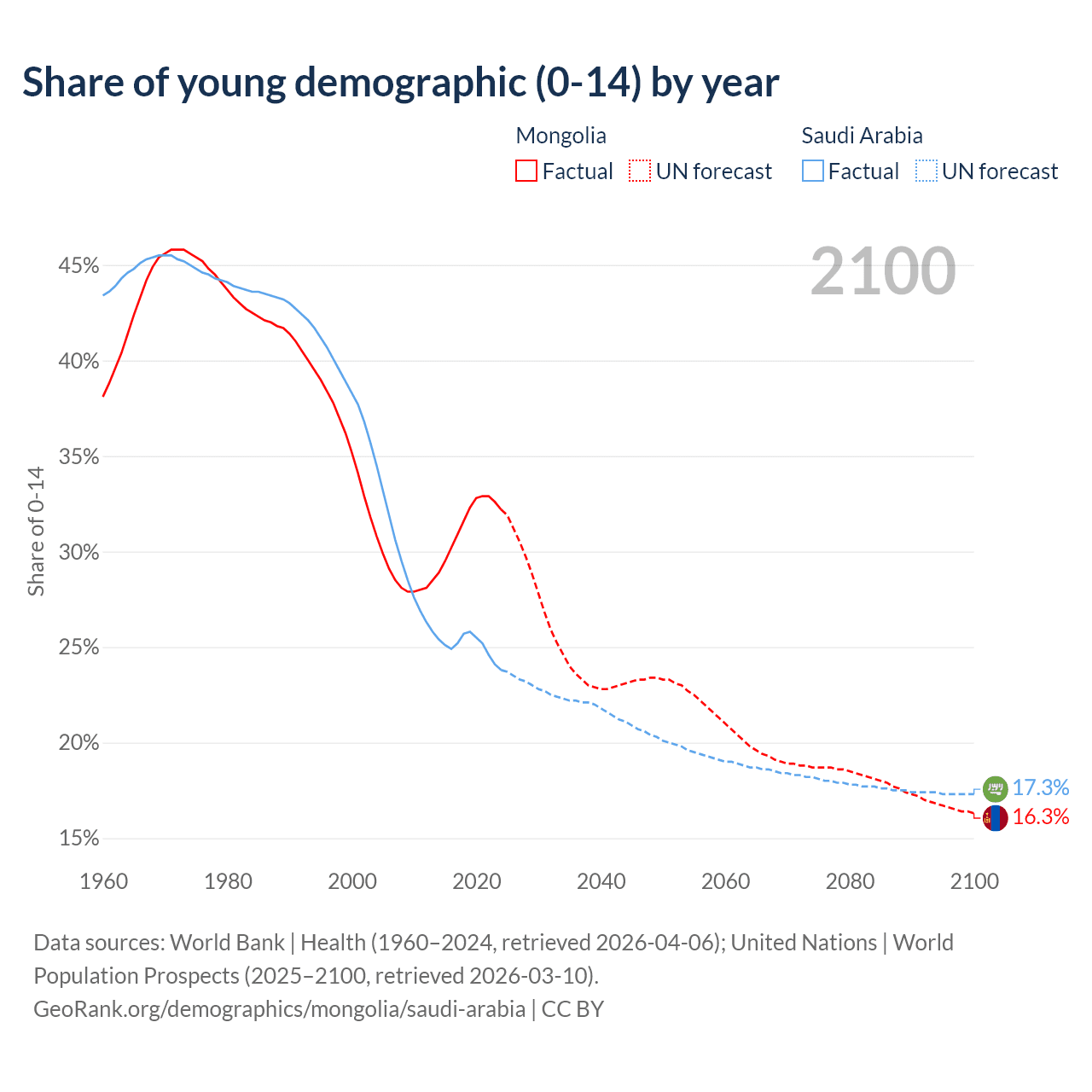 - The share of young demographic (0-15 years old) in Mongolia is 32.2% vs 23.8% in Saudi Arabia.