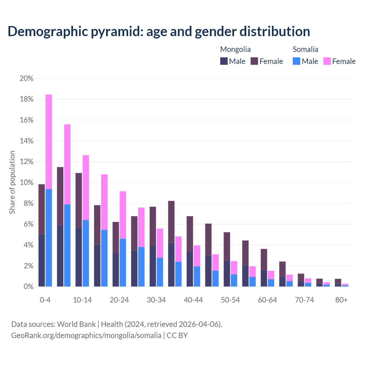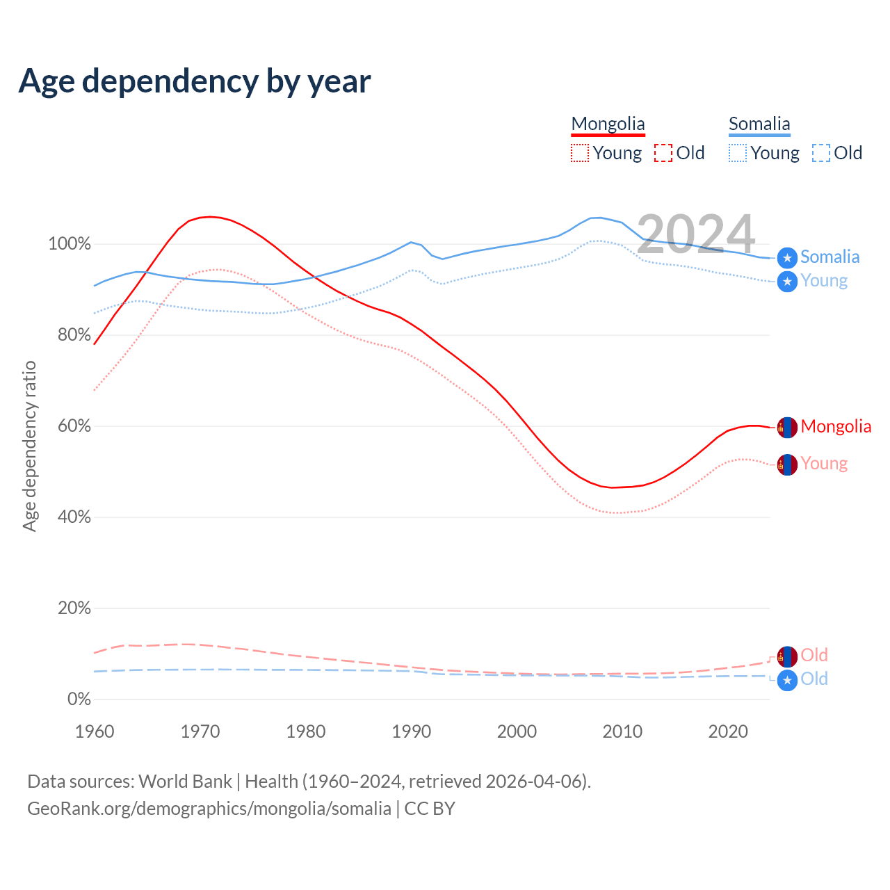 - Mongolia is ranked 117/196 by median age (oldest to youngest) vs 194/196 for Somalia.
