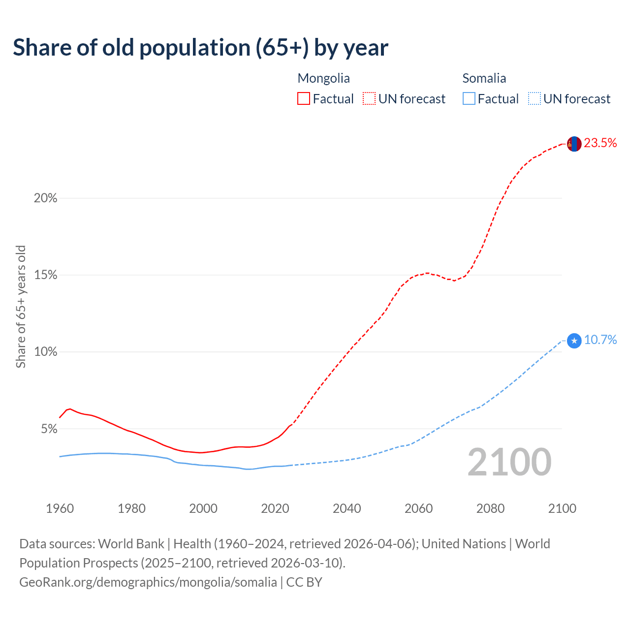 - The share of old-age demographic (65+) in Mongolia is 5.14% vs 2.59% in Somalia.