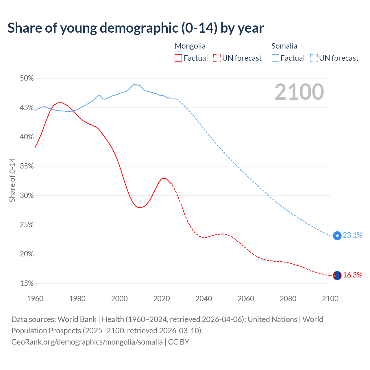 - The share of young demographic (0-15 years old) in Mongolia is 32.2% vs 46.6% in Somalia.