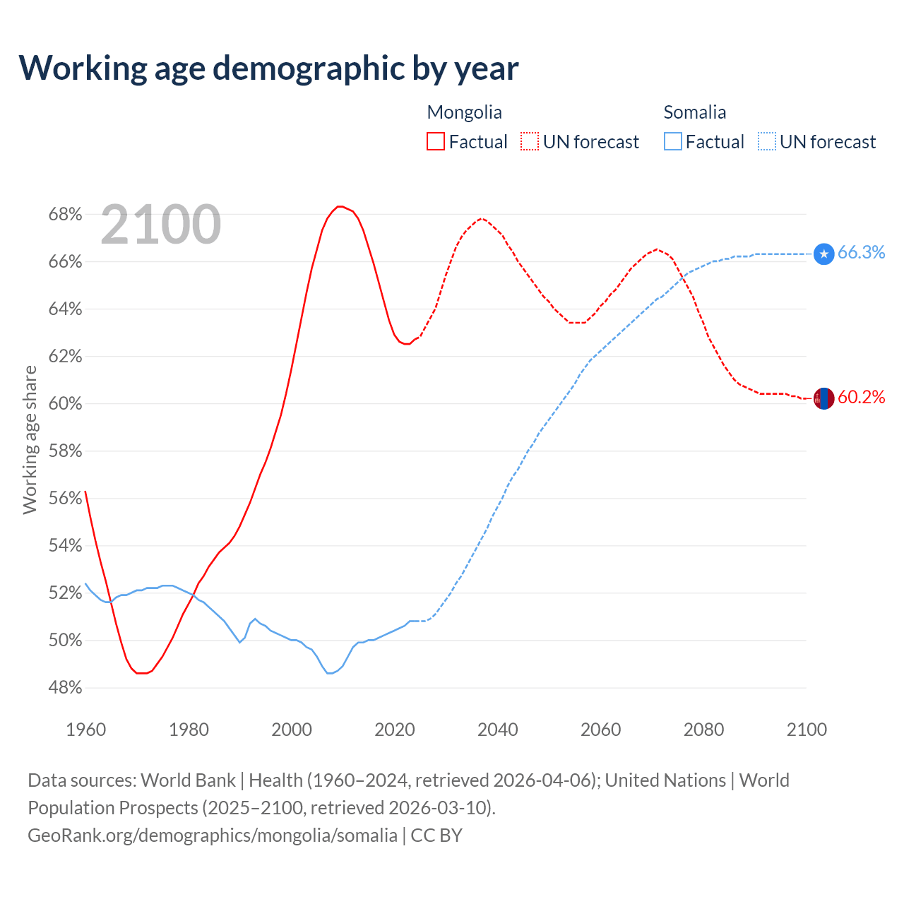 - Mongolia has 2.27M working age adults (aged 15-64) vs 10.4M in Somalia.