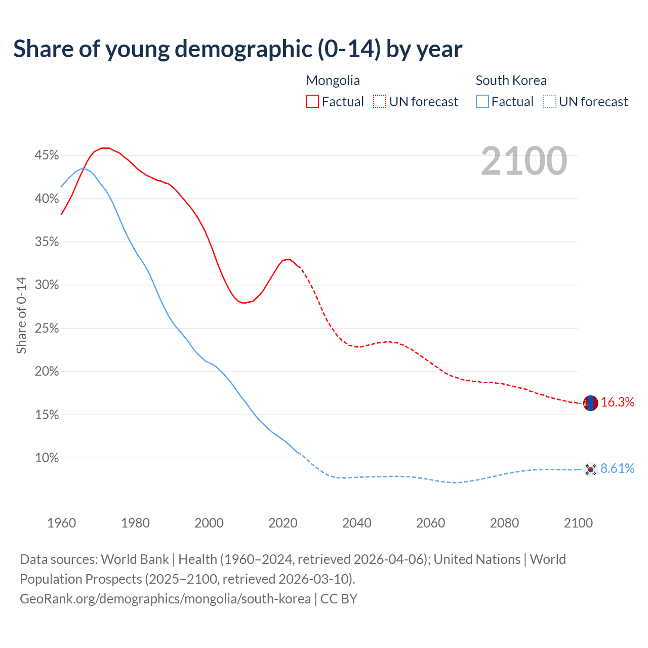 - As of 2026, the population of Mongolia is 3.62M vs 51.6M in South Korea - 14.3 times difference.