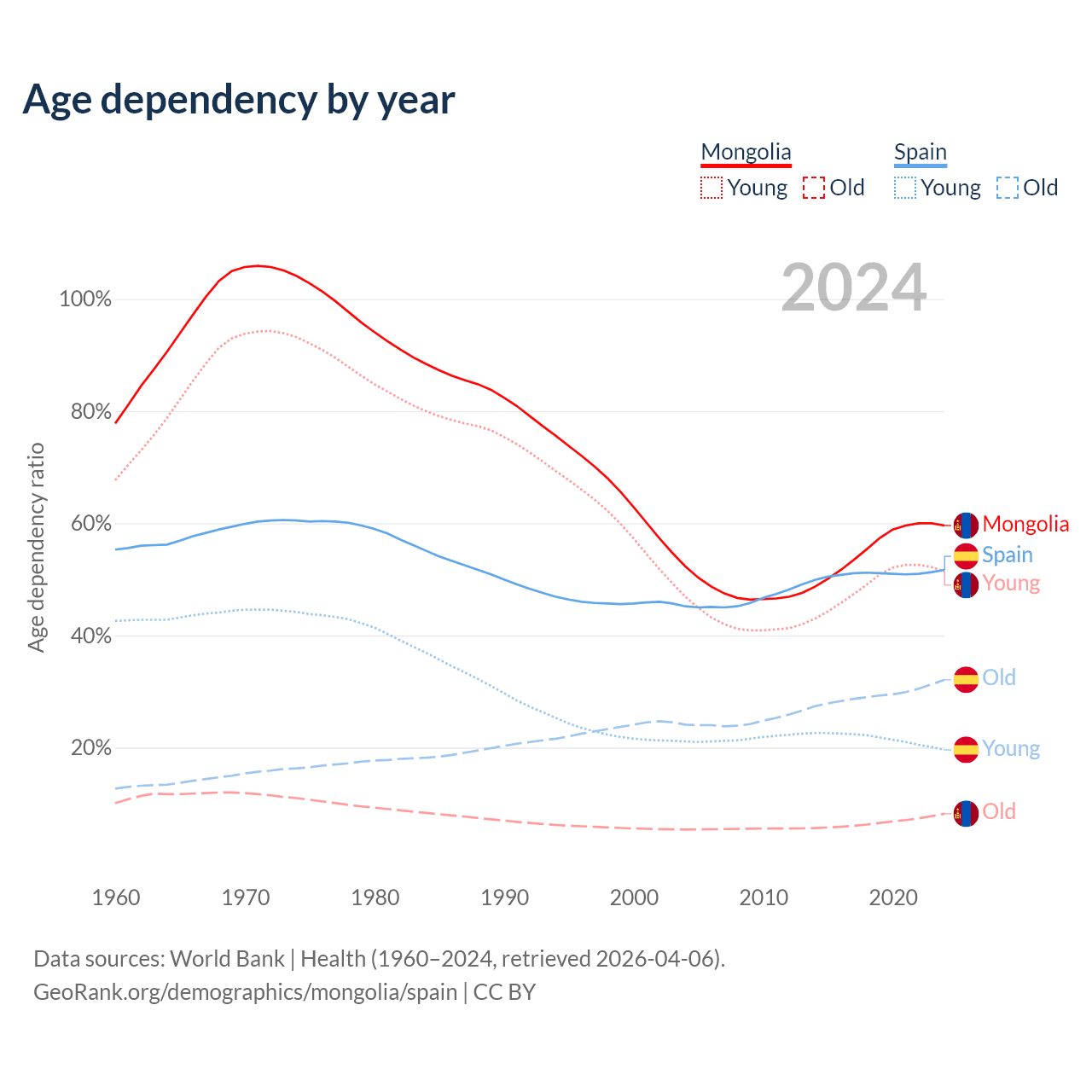 - Mongolia is ranked 117/196 by median age (oldest to youngest) vs 7/196 for Spain.