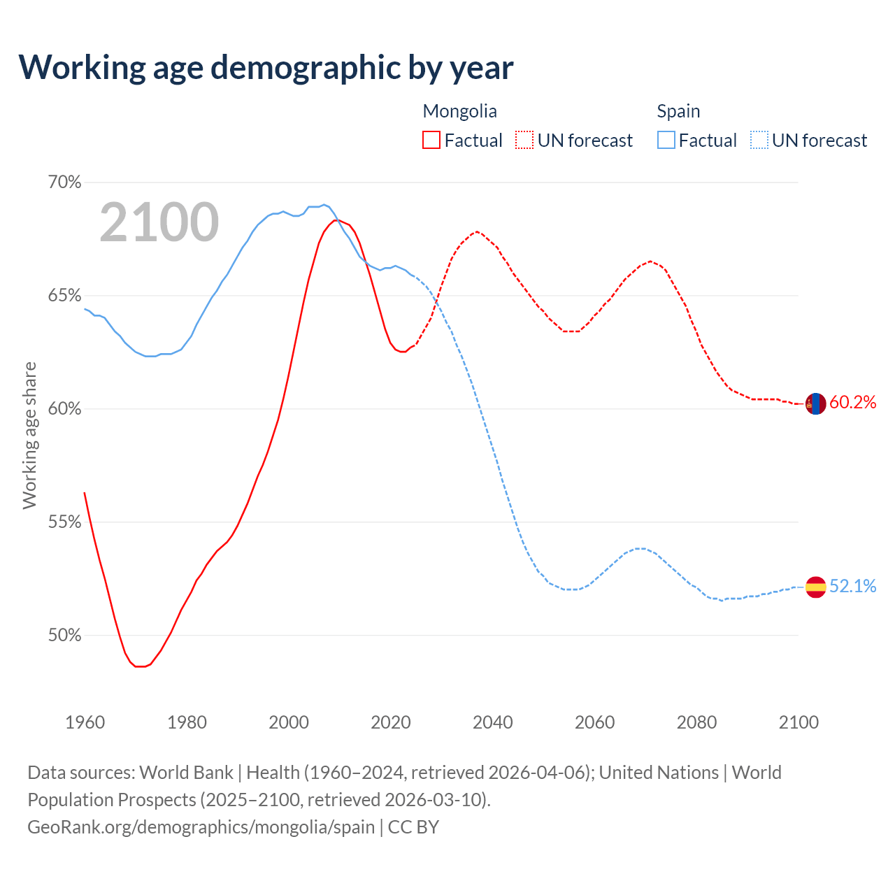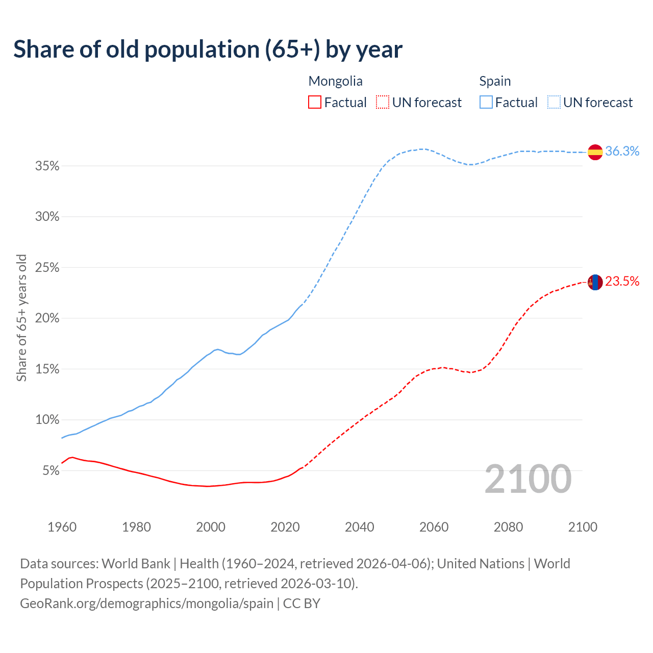 The share of older people aged 65 and over is 5.14% in Mongolia and 21.1% in Spain. Life expectancy in Mongolia compared to Spain .