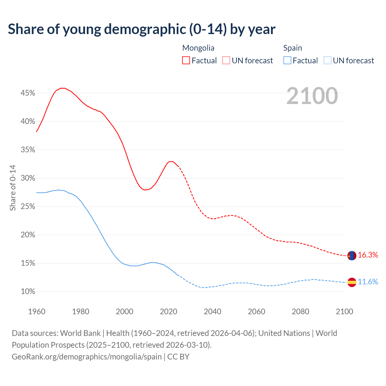 - The share of young demographic (0-15 years old) in Mongolia is 32.2% vs 12.9% in Spain.