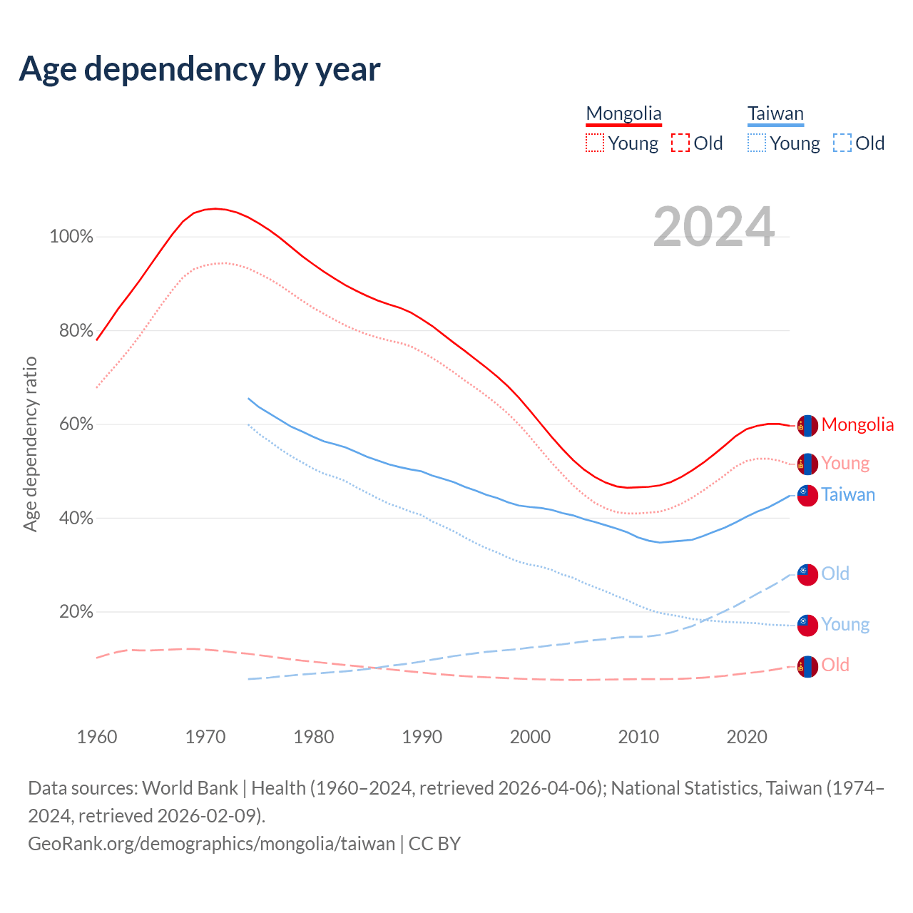 Data sources: World Bank | Health (1960–2024, retrieved 2026-04-06); U.S. Census Bureau (1960–2024, retrieved 2026-02-08); National Statistics, Taiwan (1974–2024, retrieved 2026-02-09).