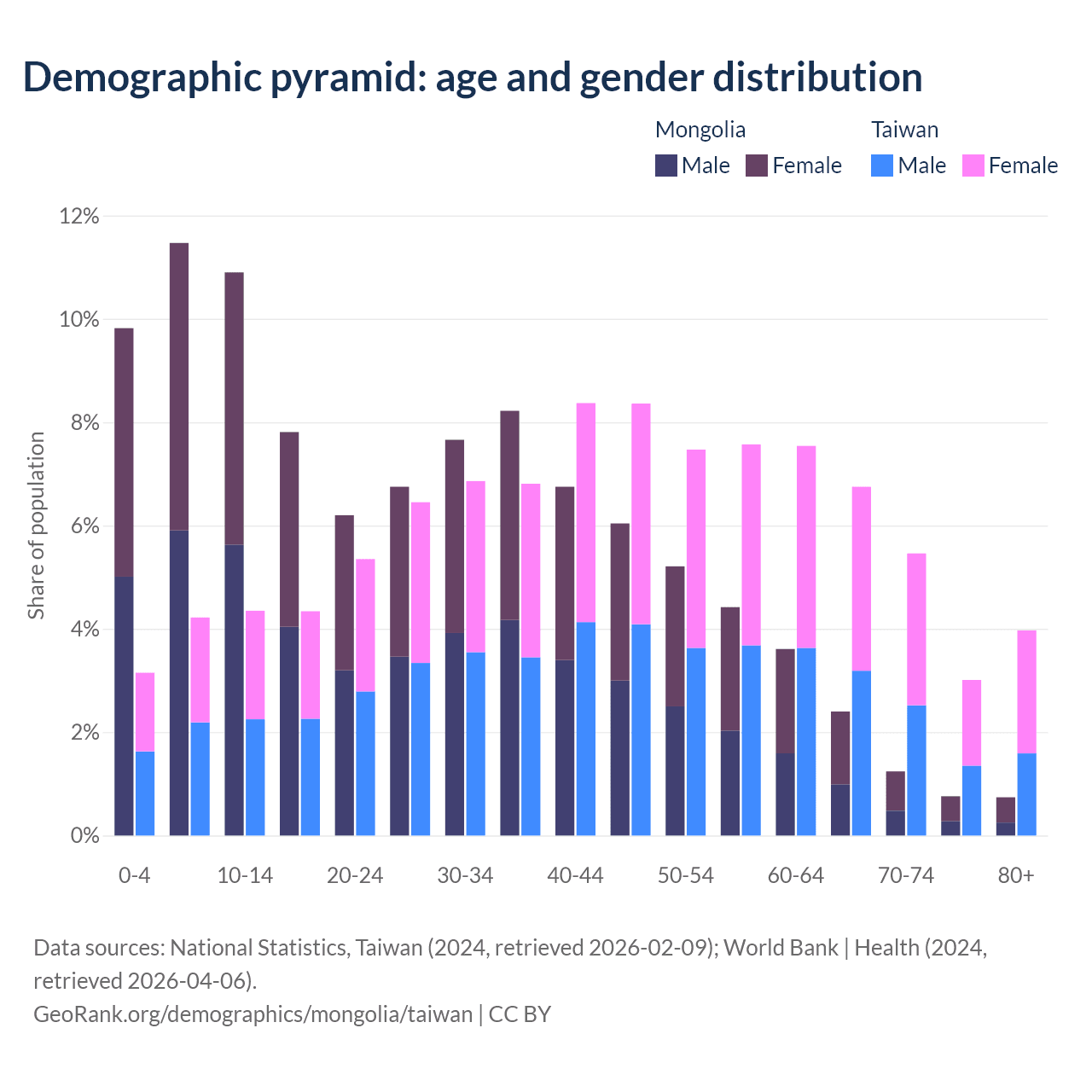 - Mongolia is ranked 117/196 by median age (oldest to youngest) vs 16/196 for Taiwan.