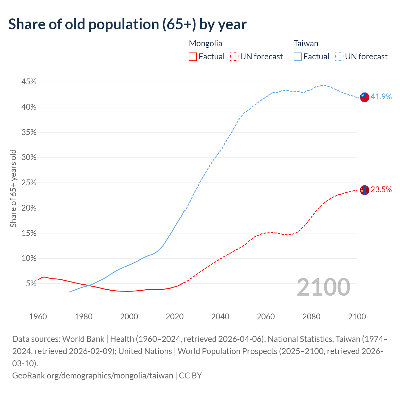 The share of older people aged 65 and over is 5.14% in Mongolia and 19.2% in Taiwan. Life expectancy in Mongolia compared to Taiwan .