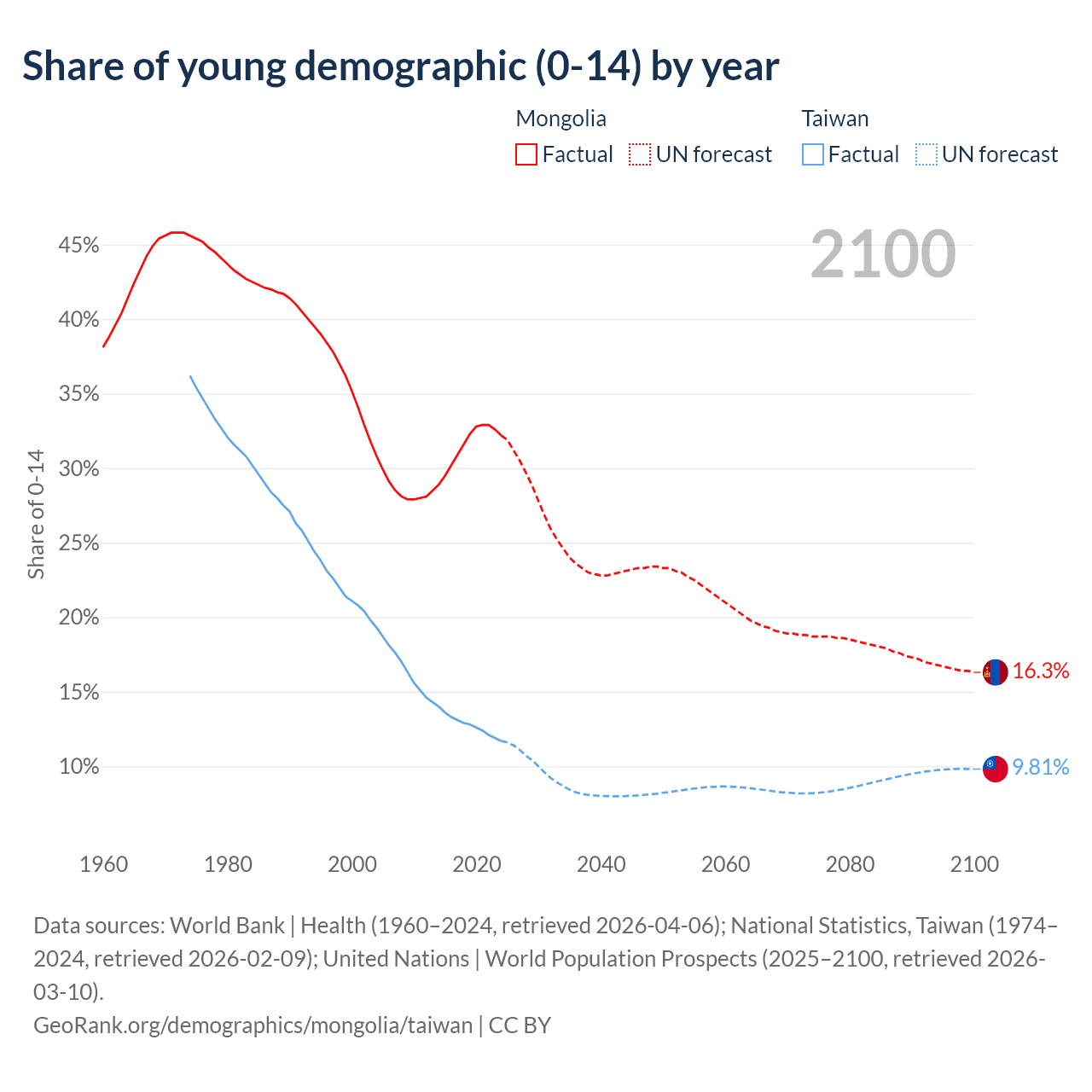 - The share of young demographic (0-15 years old) in Mongolia is 32.2% vs 11.7% in Taiwan.