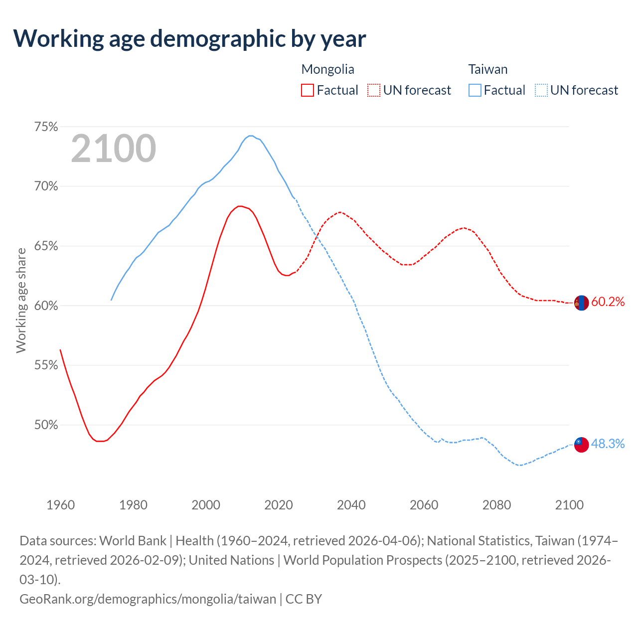 - Mongolia has 2.27M working age adults (aged 15-64) vs 16.1M in Taiwan.