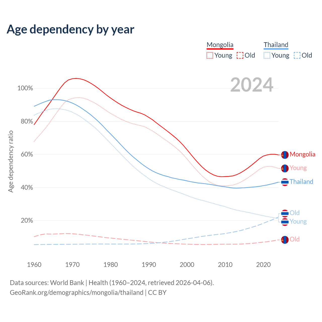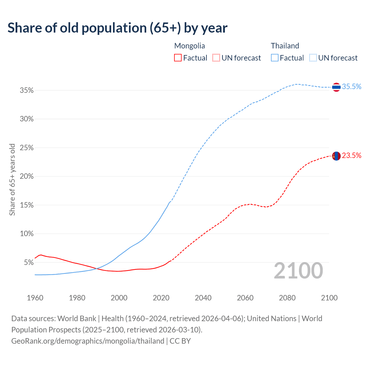 The share of older people aged 65 and over is 5.14% in Mongolia and 15.4% in Thailand. Life expectancy in Mongolia compared to Thailand .