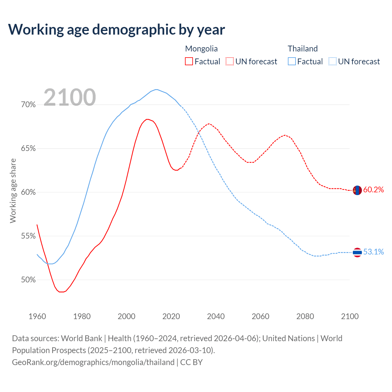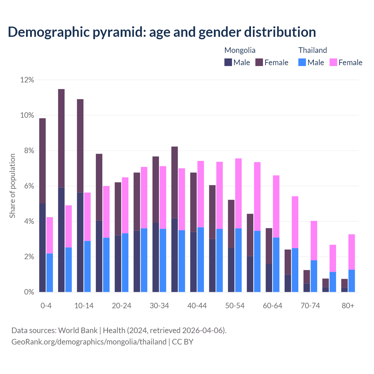 - Mongolia is ranked 117/196 by median age (oldest to youngest) vs 40/196 for Thailand.