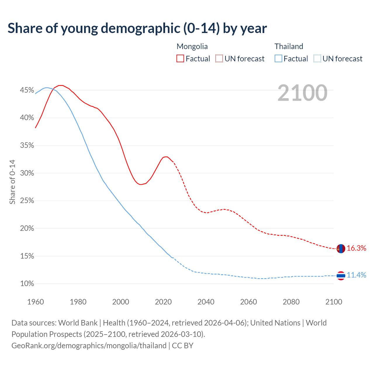 - As of 2026, the population of Mongolia is 3.62M vs 71.6M in Thailand - 19.8 times difference.