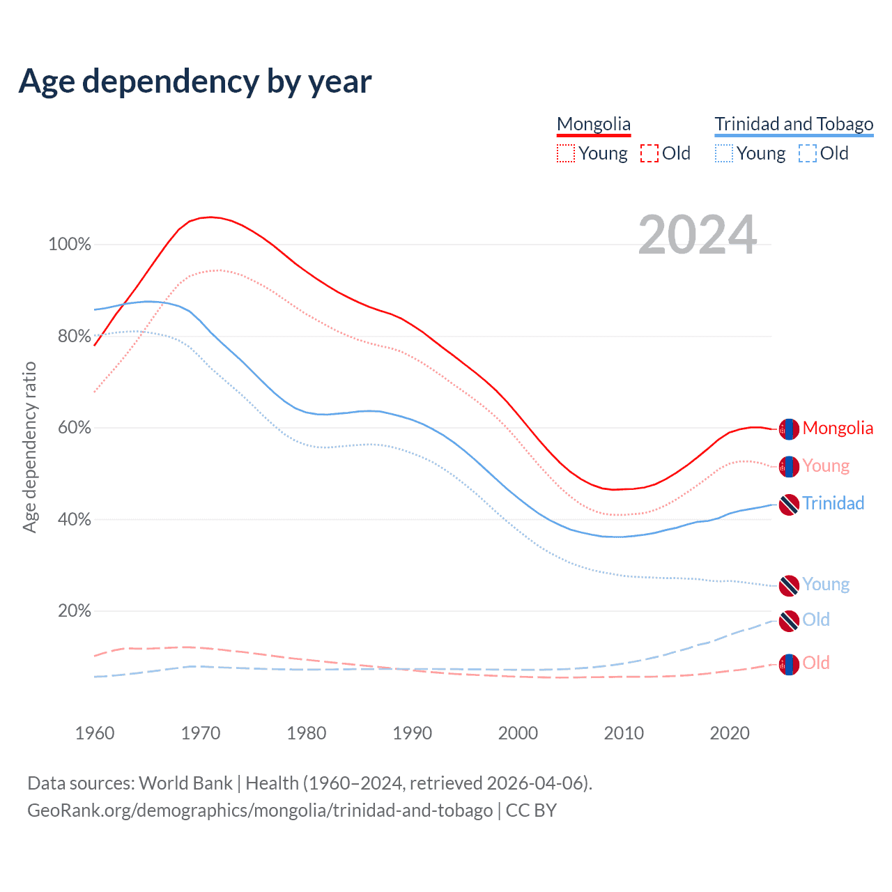 - Mongolia is ranked 117/196 by median age (oldest to youngest) vs 58/196 for Trinidad and Tobago.