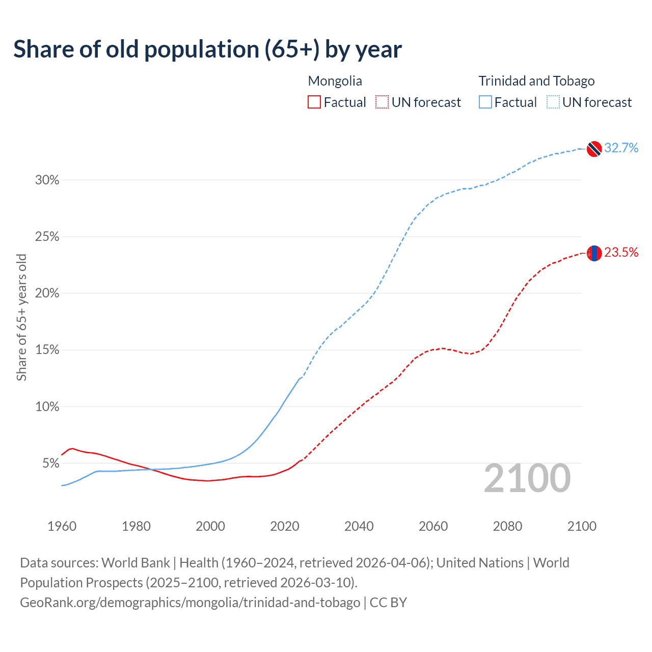 The share of older people aged 65 and over is 5.14% in Mongolia and 12.4% in Trinidad and Tobago. Life expectancy in Mongolia compared to Trinidad and Tobago .