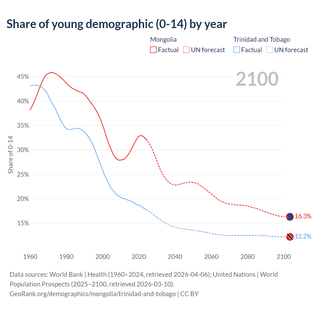 - The share of young demographic (0-15 years old) in Mongolia is 32.2% vs 17.8% in Trinidad and Tobago.