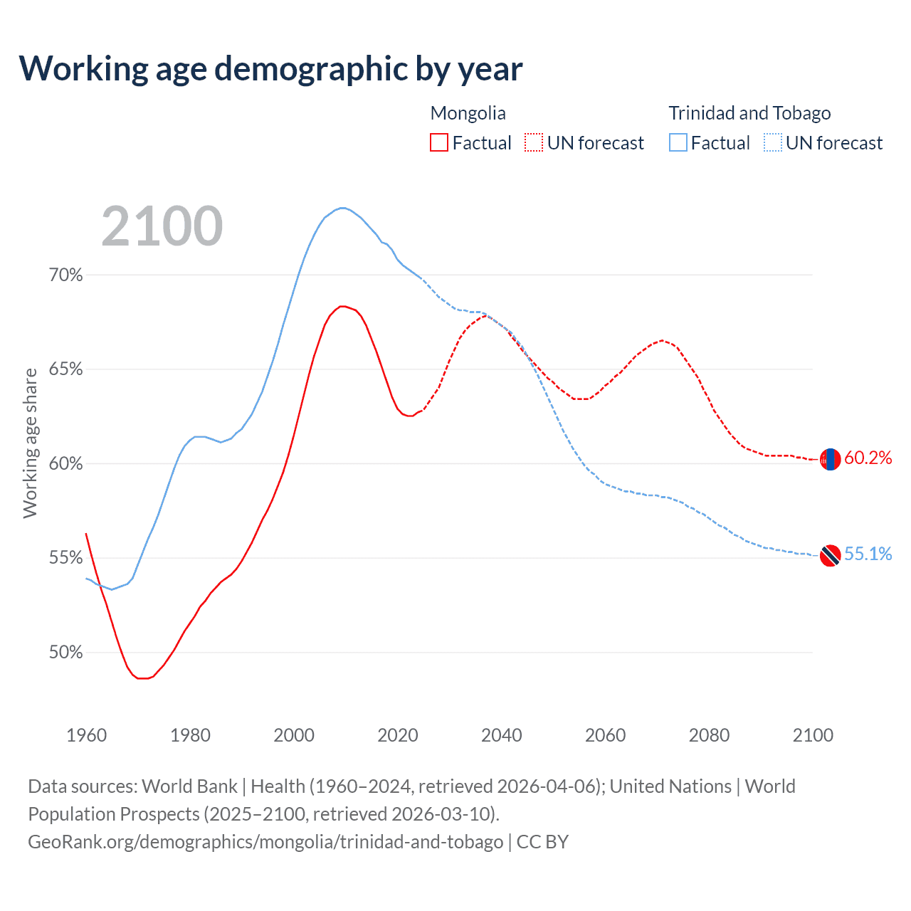 - Mongolia has 2.27M working age adults (aged 15-64) vs 960K in Trinidad and Tobago.