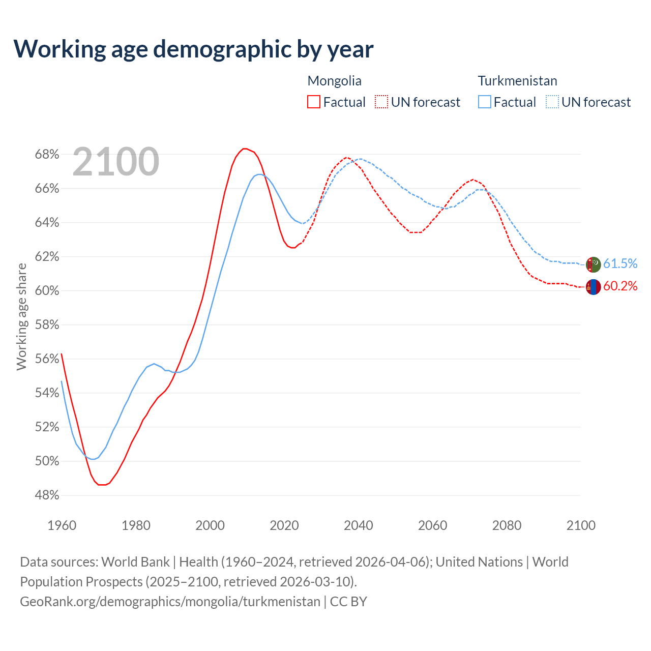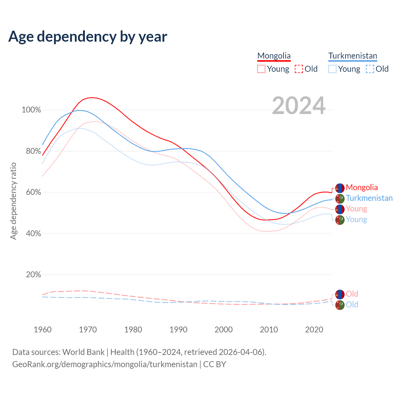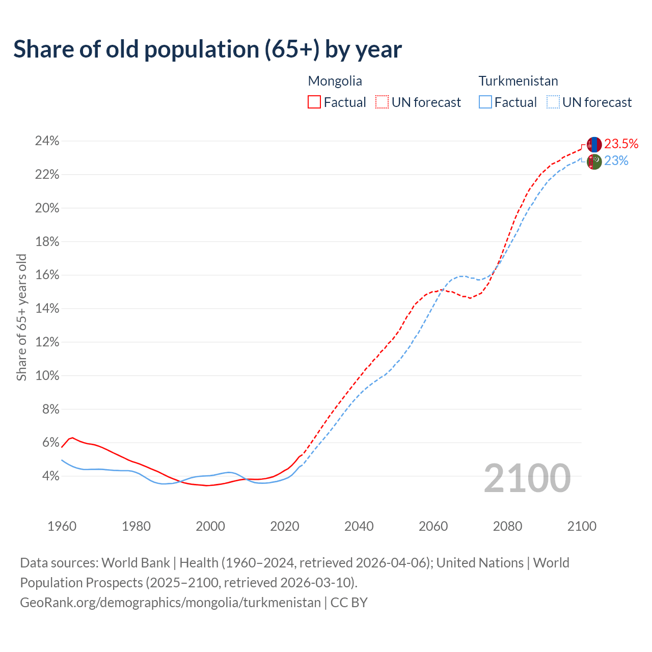 The share of older people aged 65 and over is 5.14% in Mongolia and 4.53% in Turkmenistan. Life expectancy in Mongolia compared to Turkmenistan .