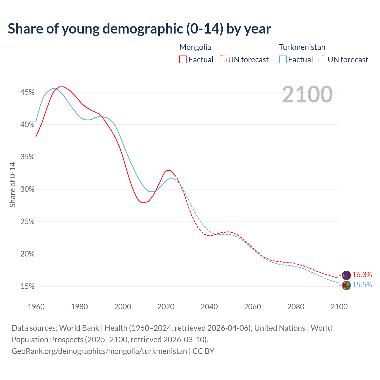 - The share of young demographic (0-15 years old) in Mongolia is 32.2% vs 31.5% in Turkmenistan.