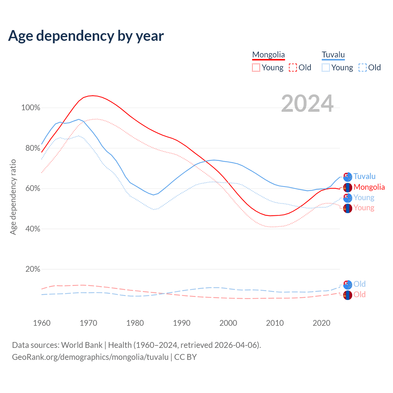 - Mongolia is ranked 117/196 by median age (oldest to youngest) vs 132/196 for Tuvalu.
