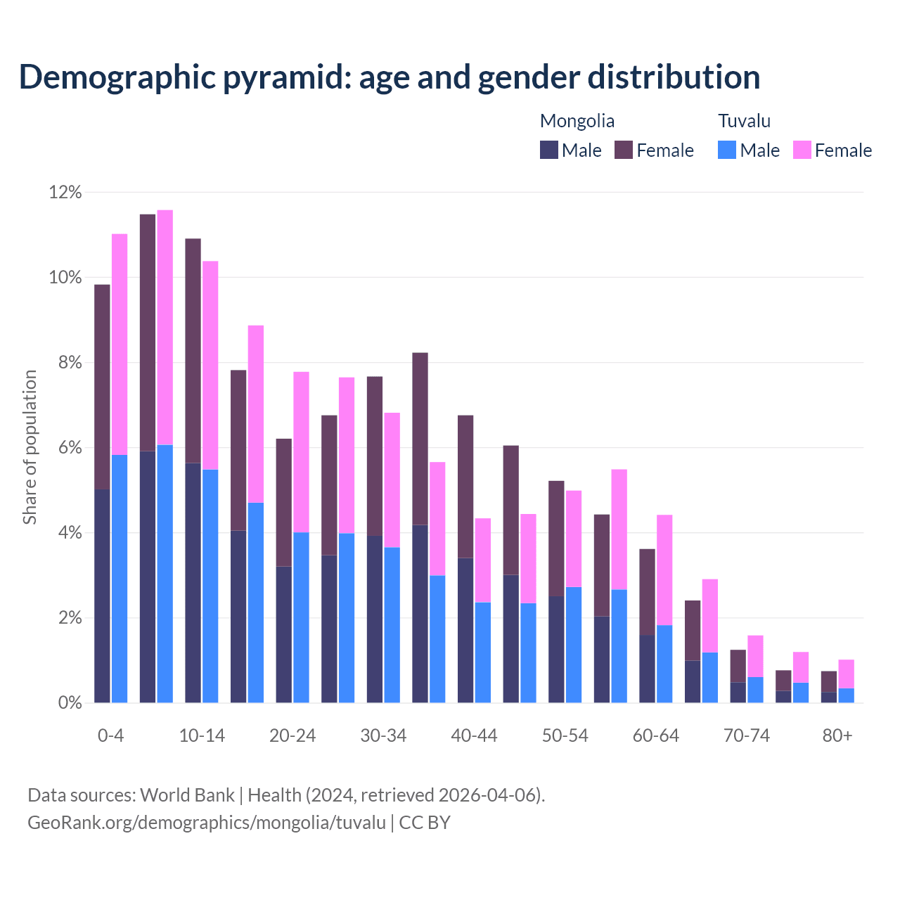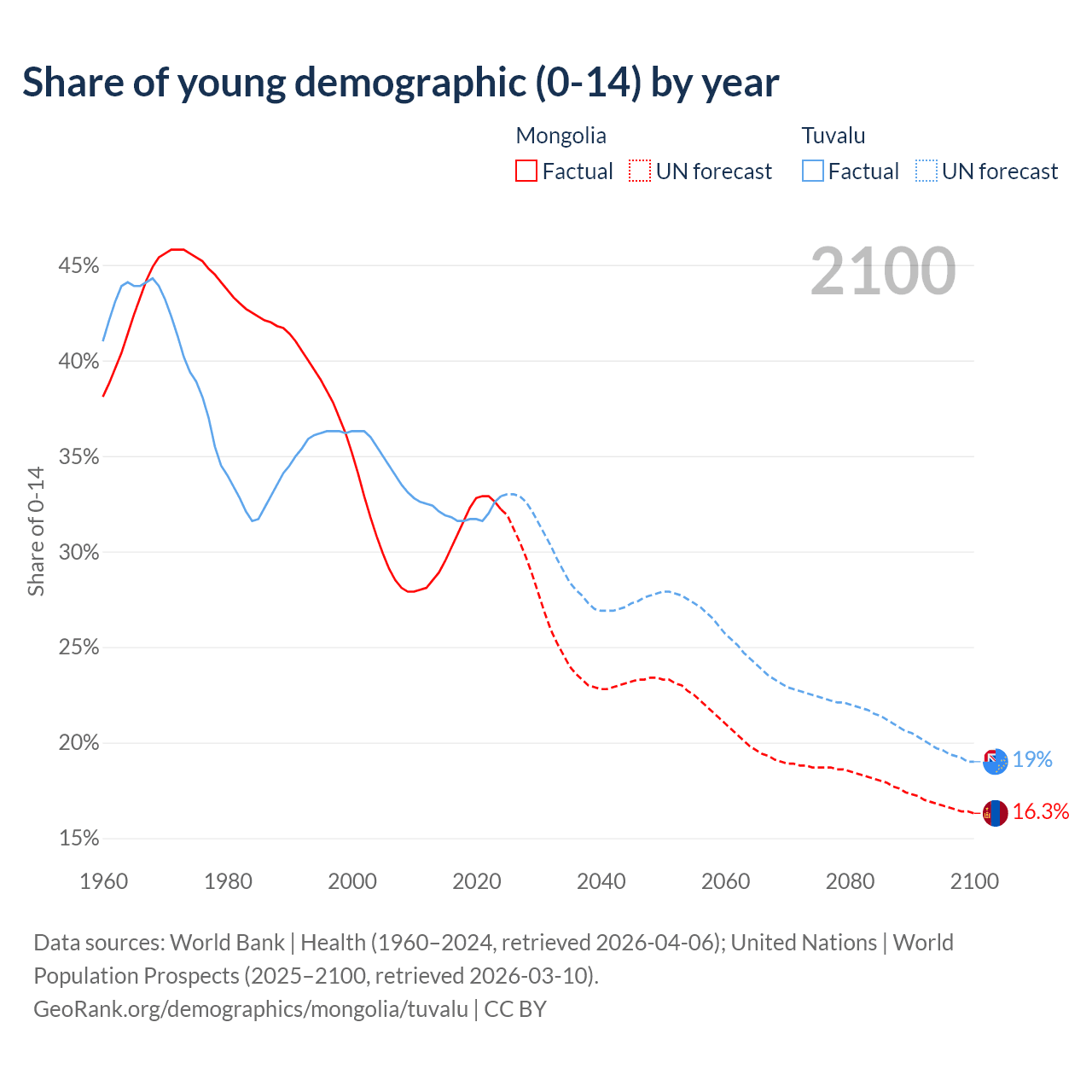 - The share of young demographic (0-15 years old) in Mongolia is 32.2% vs 32.9% in Tuvalu.