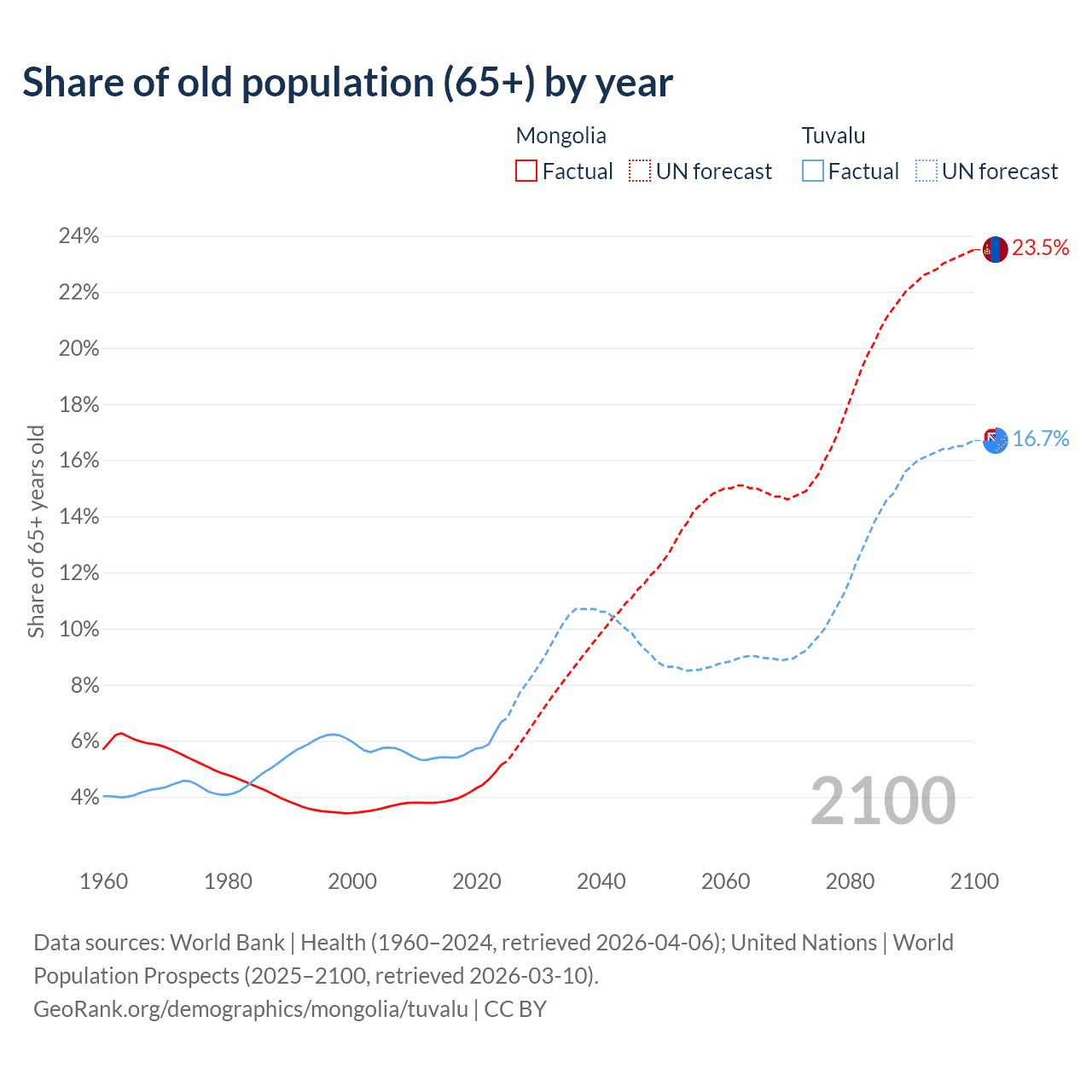 - The share of old-age demographic (65+) in Mongolia is 5.14% vs 6.67% in Tuvalu.
