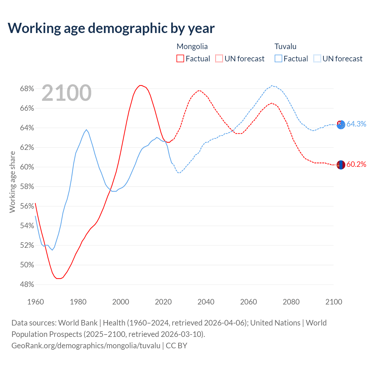 - Mongolia has 2.27M working age adults (aged 15-64) vs 5.64K in Tuvalu.
