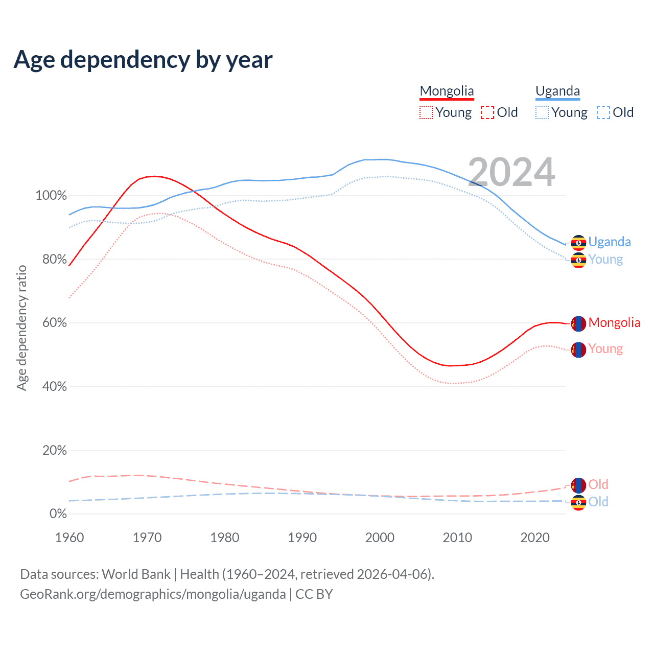 - The share of old-age demographic (65+) in Mongolia is 5.14% vs 2.19% in Uganda.