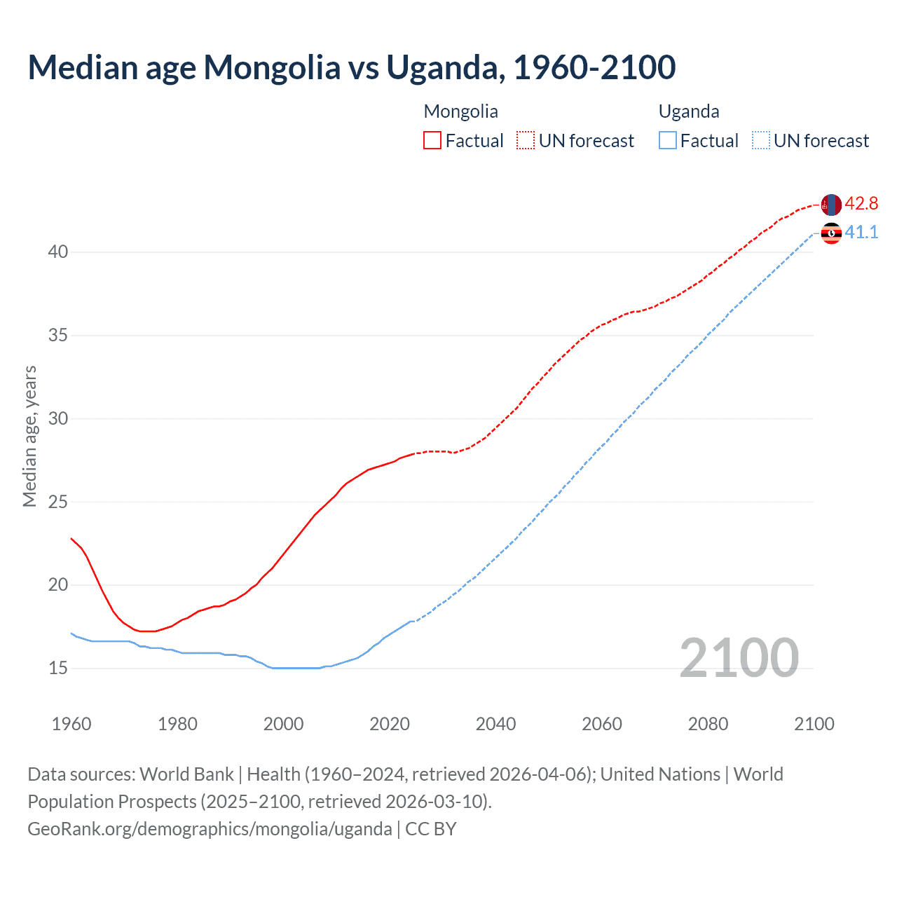 - The median age in Mongolia is 27.8 years compared to 17.8 years in Uganda.