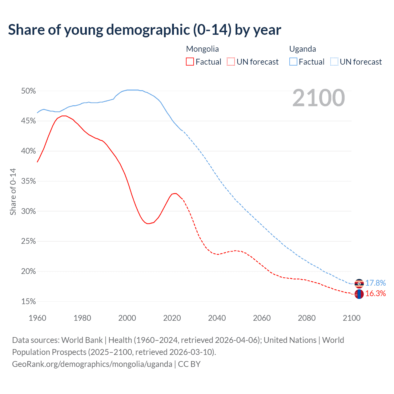 - The share of young demographic (0-15 years old) in Mongolia is 32.2% vs 43.5% in Uganda.