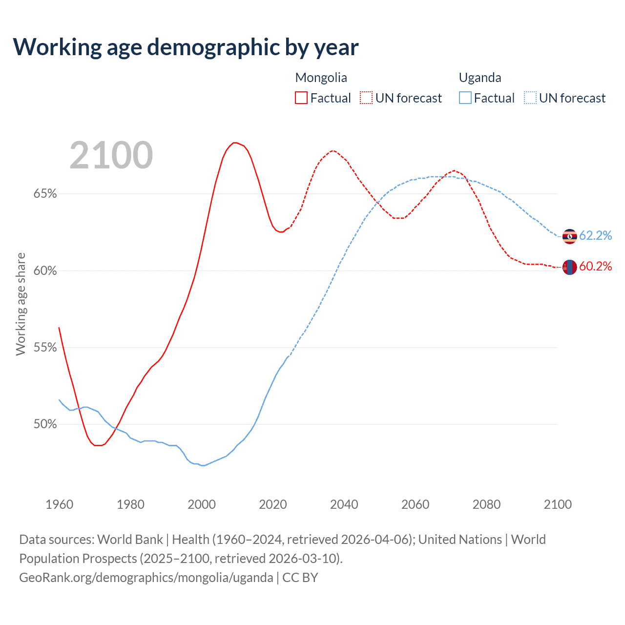 - Mongolia has 2.27M working age adults (aged 15-64) vs 28.9M in Uganda.