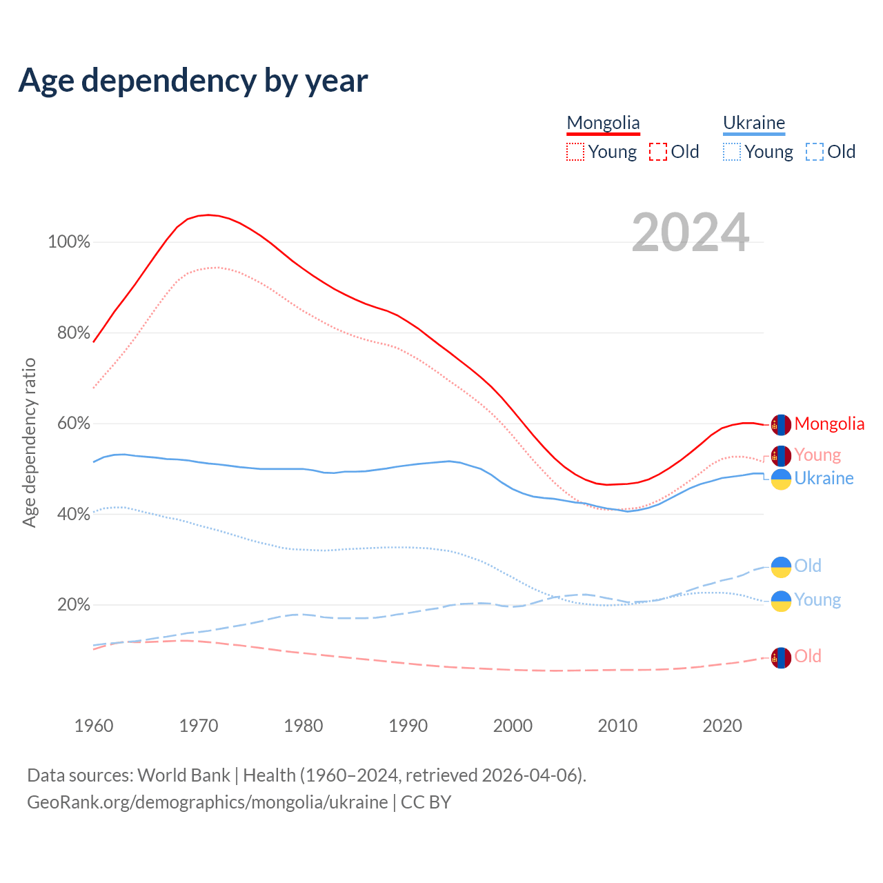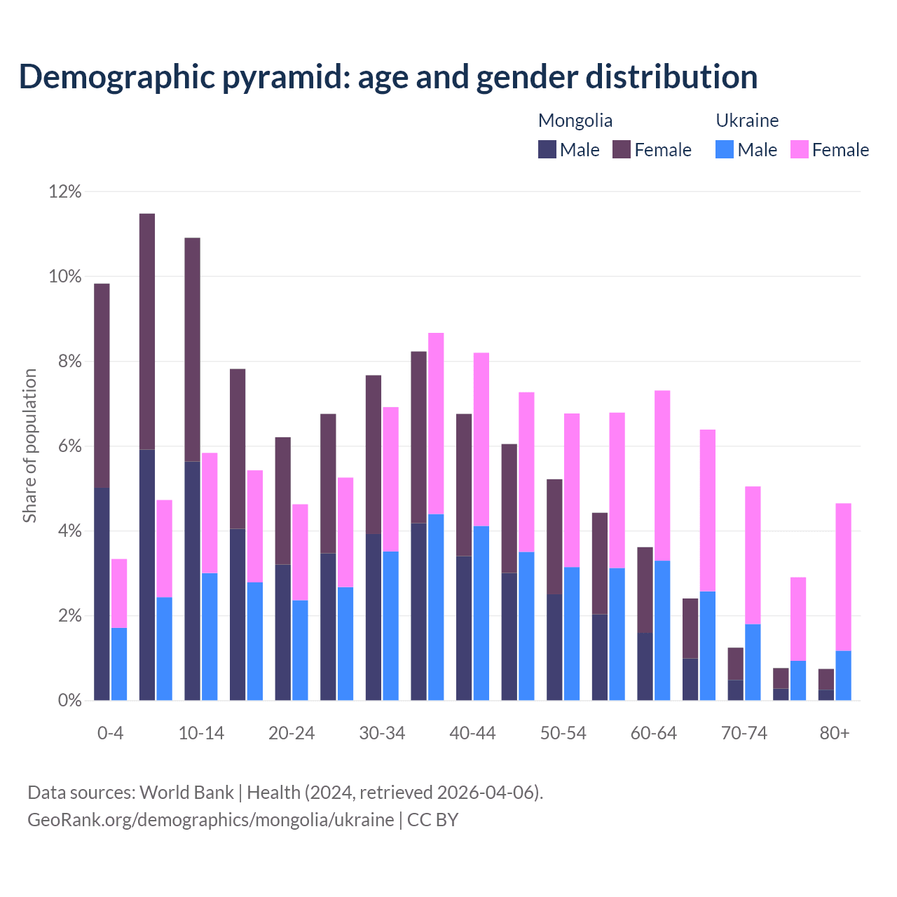 - Mongolia is ranked 117/196 by median age (oldest to youngest) vs 26/196 for Ukraine.