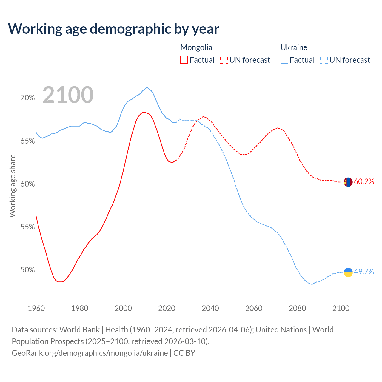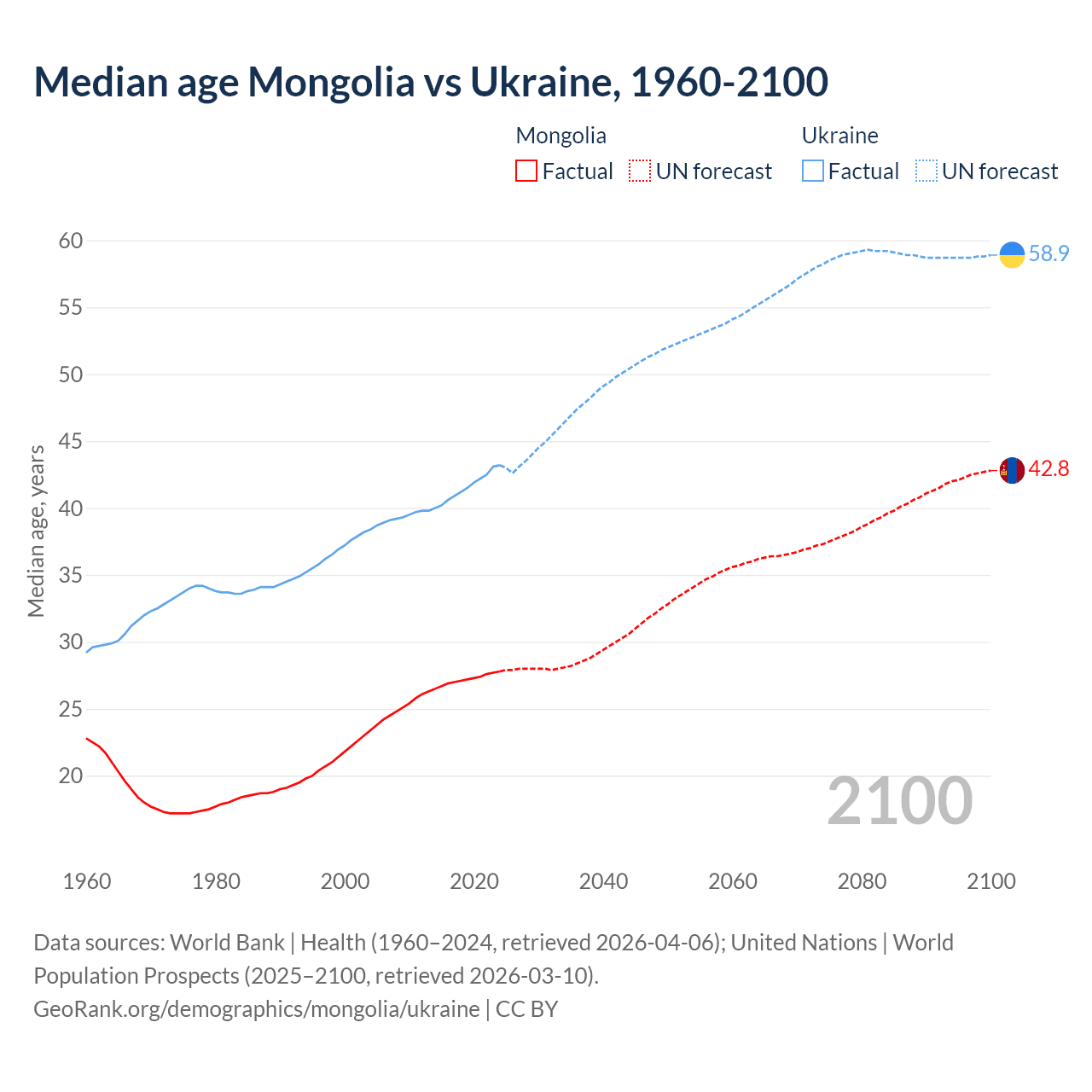 Median age Mongolia vs Ukraine, 1960-2100