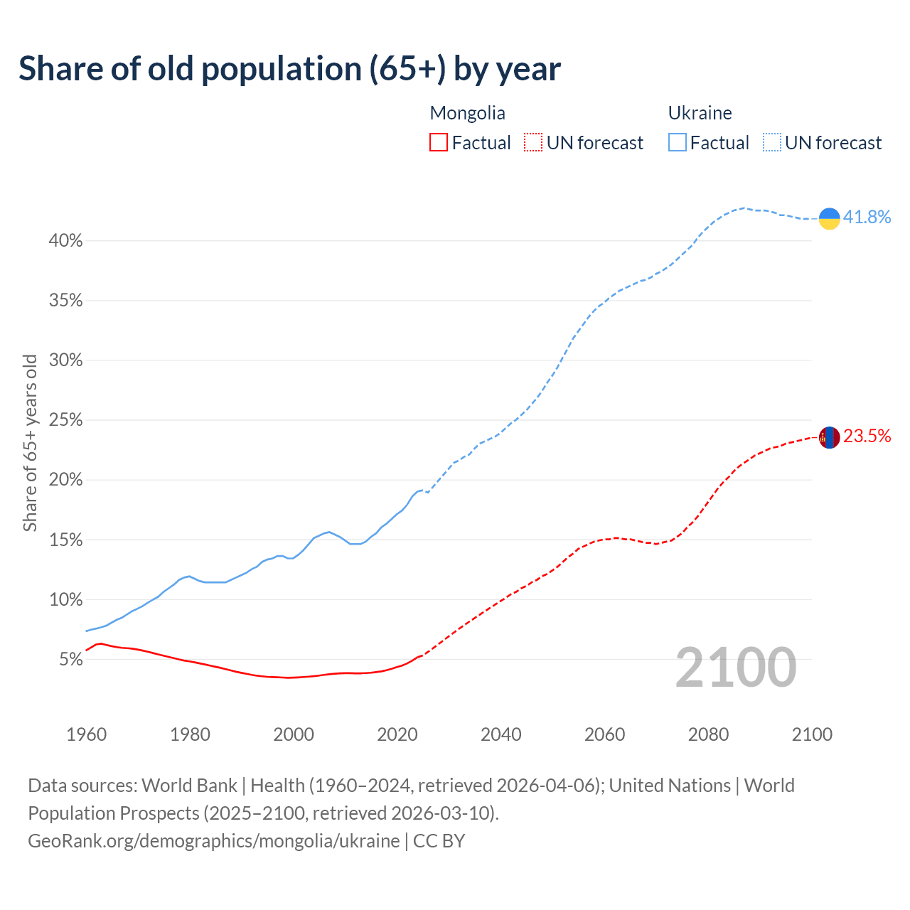 The share of older people aged 65 and over is 5.14% in Mongolia and 19% in Ukraine. Life expectancy in Mongolia compared to Ukraine .