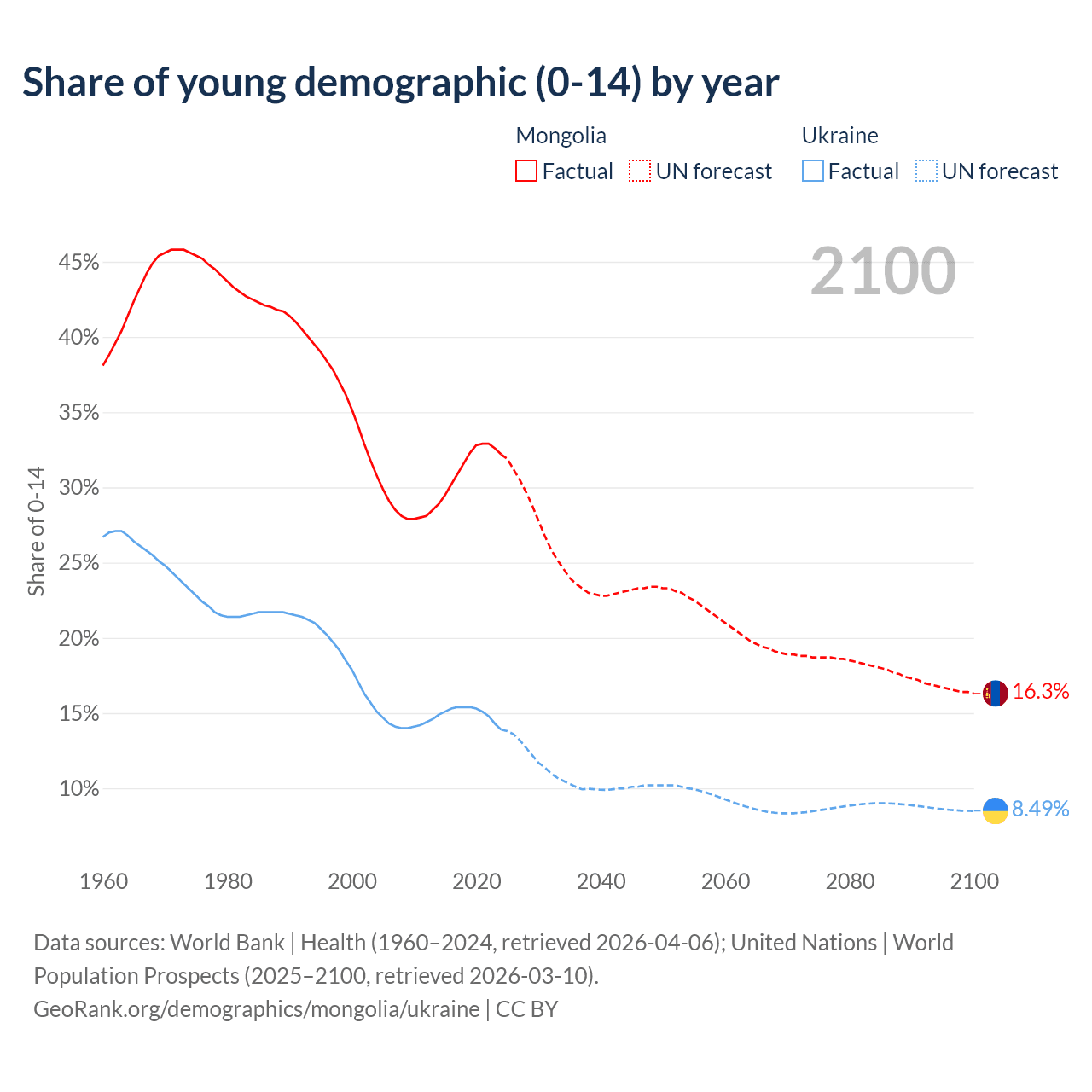 - The share of young demographic (0-15 years old) in Mongolia is 32.2% vs 13.9% in Ukraine.